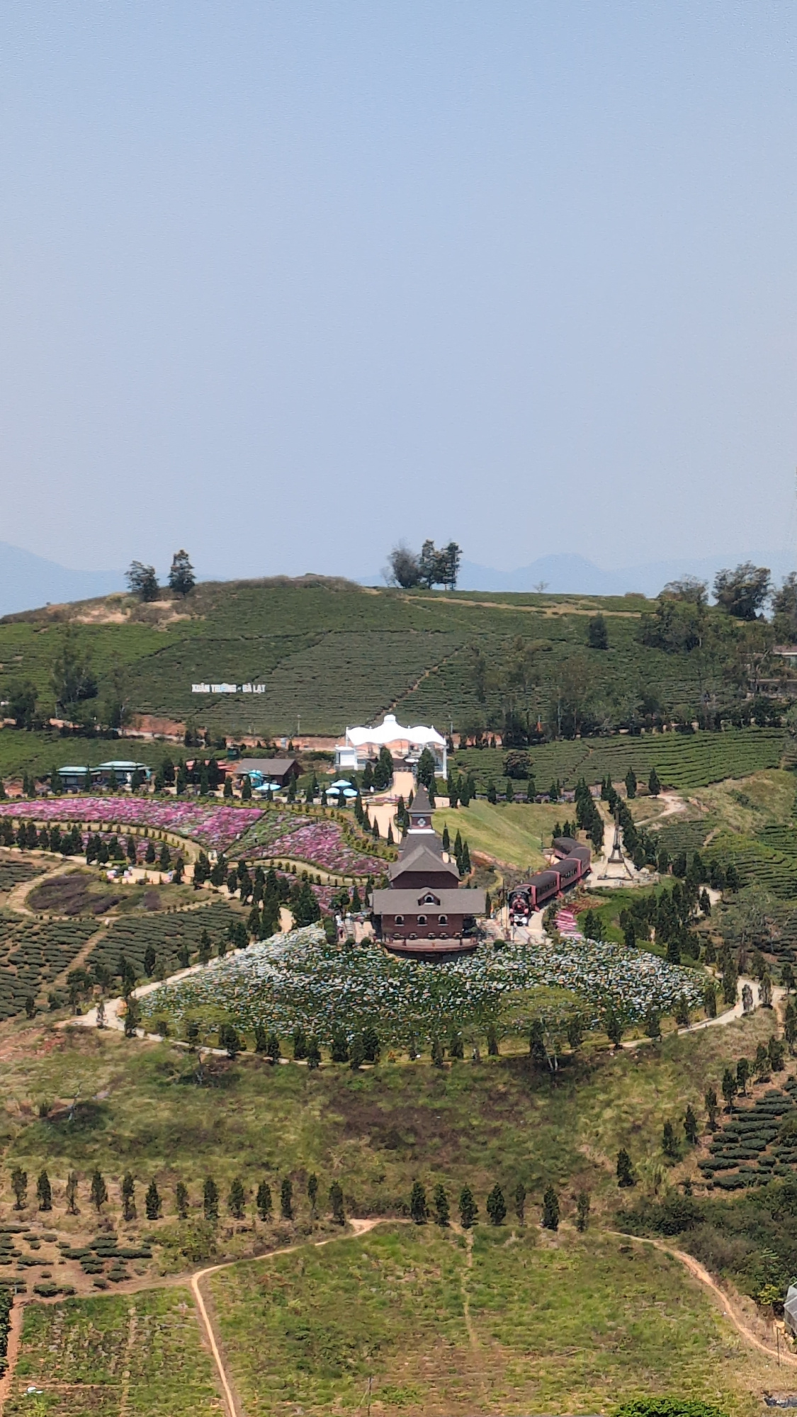 The image depicts a bird's-eye view of a landscape near Phát Chi, Vietnam. The scene features a tea plantation with neatly organized rows of tea bushes. A building with a dark roof and an adjacent whi…read more