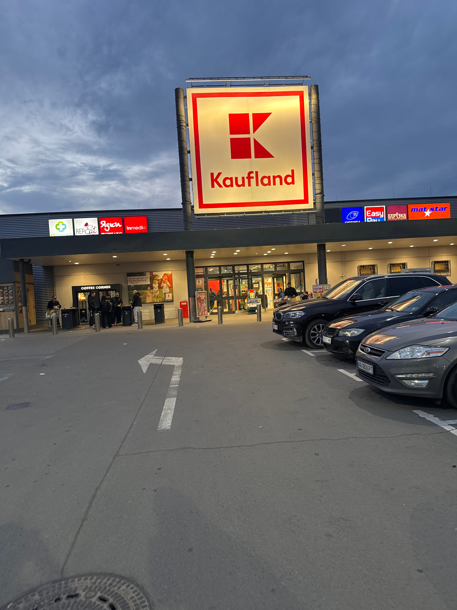 The image shows the exterior of a Kaufland supermarket. There is a large Kaufland sign. Several other storefront signs are visible, including "Easy Credit", "mat star", "REP & Ядки", "inmedio", and "C…read more