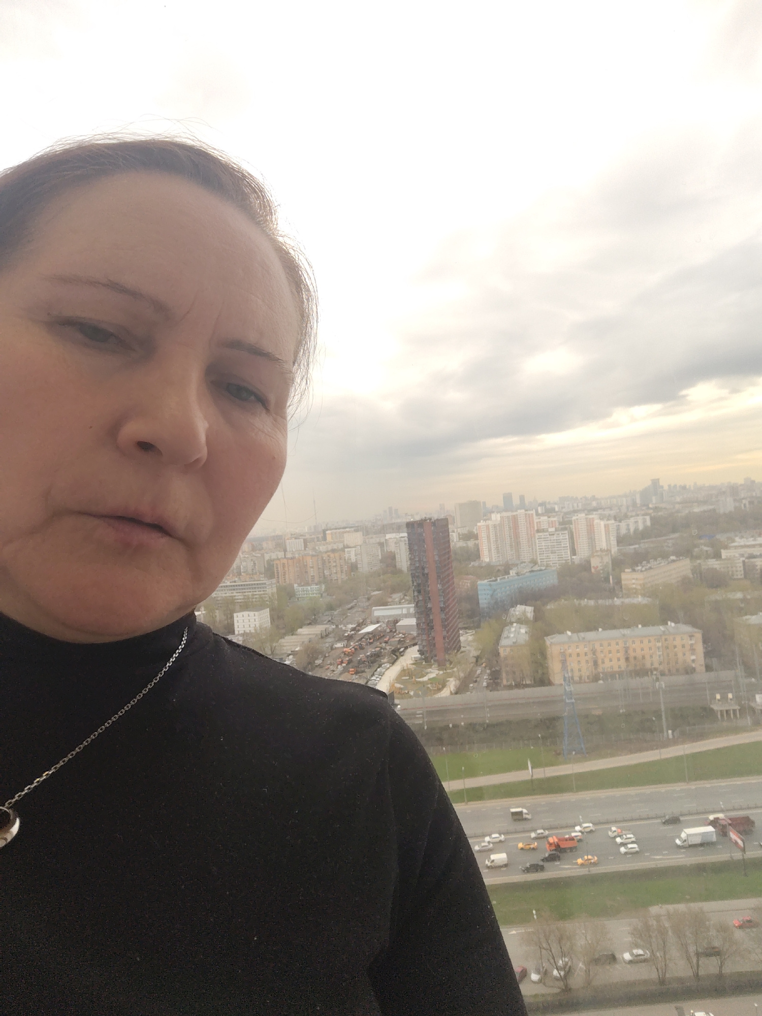 The image is a selfie taken by a woman from a high vantage point, overlooking a sprawling city on an overcast day. The primary subject is a middle-aged woman, whose face occupies the left side of the…read more