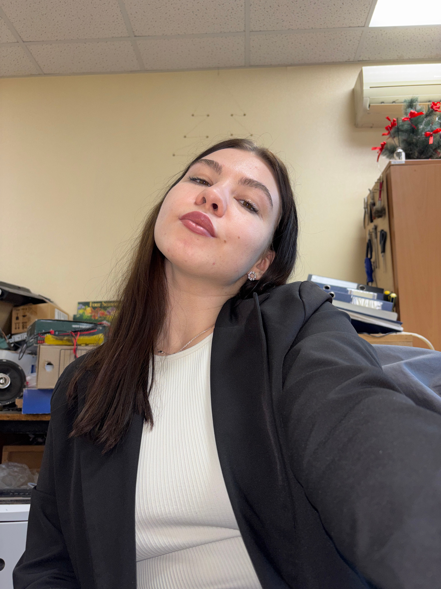 A photograph shows a woman with dark hair and fair skin, wearing a white top and black jacket. She is indoors, likely in an office or workplace setting, based on the presence of ceiling tiles and offi…read more