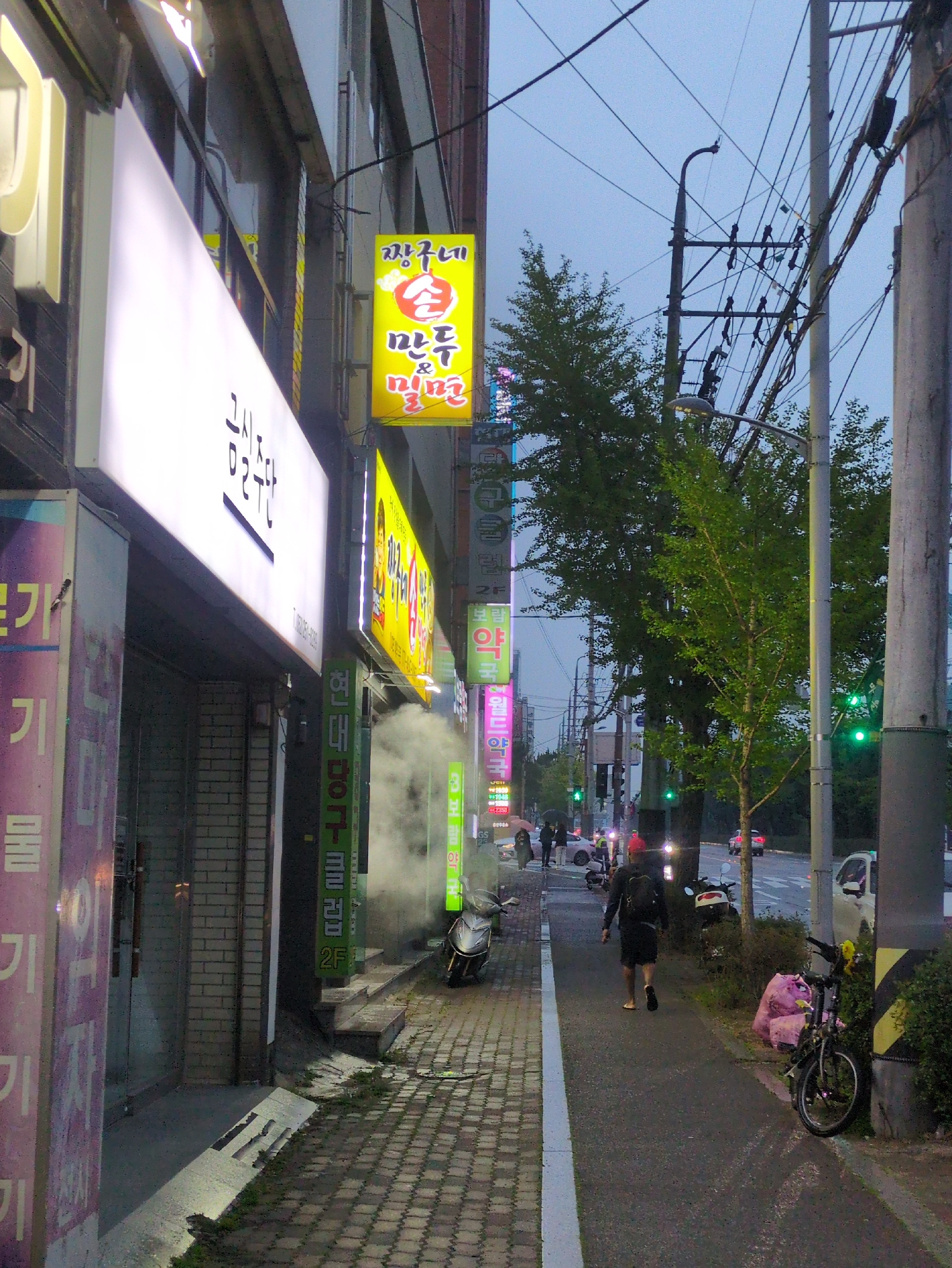 This image presents a vibrant urban street scene in Ulsan, South Korea, captured during dusk or early evening. The sky is a muted blue, transitioning from day to night, with artificial lights from com…read more