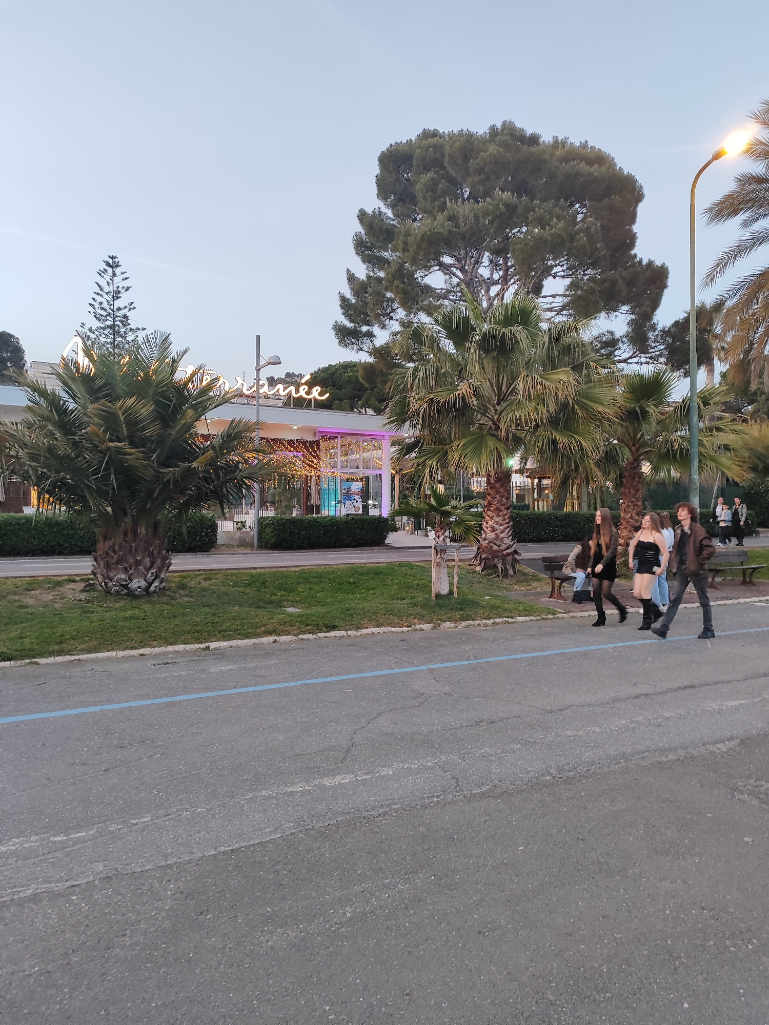 The image depicts an outdoor scene in Sanremo, Italy. The scene features a road with a blue line marking. Three people are walking across the road. To the right of the road are several palm trees andβ¦read more
