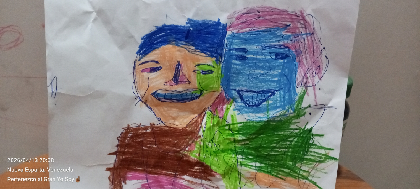 A crayon drawing on white paper depicts two figures. The figure on the left has brown skin, blue hair, a pink nose, and a green patch on the face. The figure is wearing a brown top. The figure on the…read more