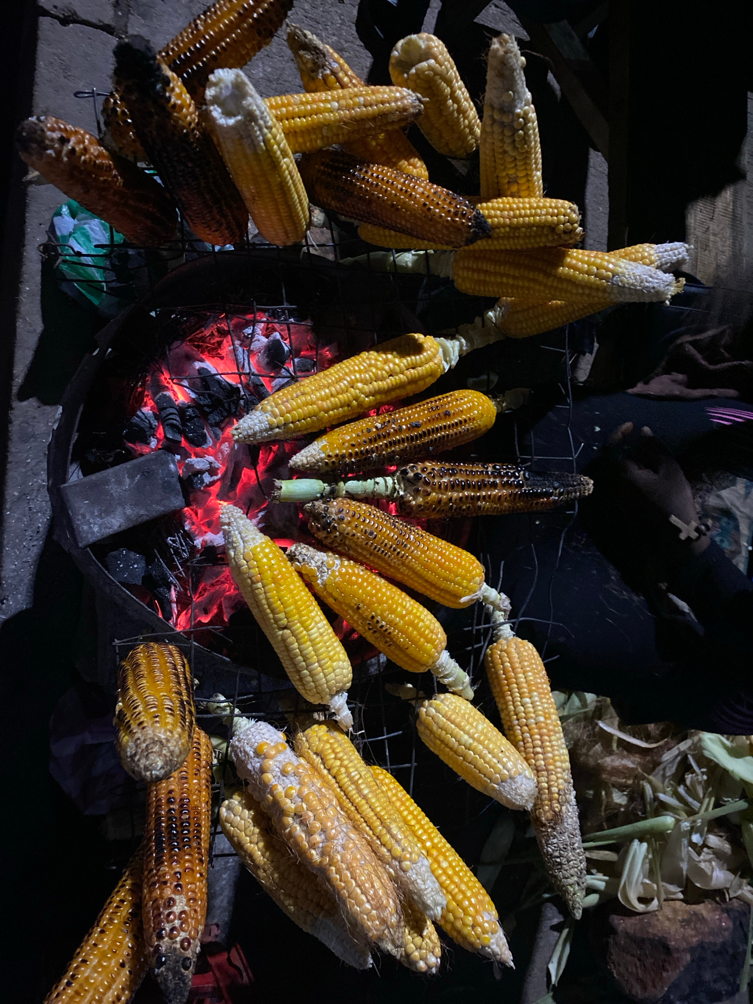 A top-down shot shows grilled corn on the cob over burning coals. The corn is arranged on a metal grill, with some cobs still yellow and others browned or charred from the heat. In the background, a pā¦read more