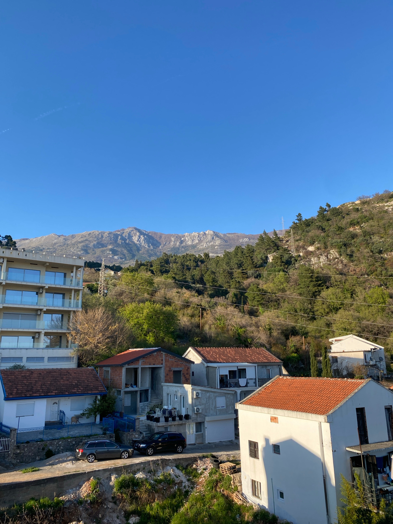 The image depicts a view in Budva, Montenegro. The scene features a mountain range on the left side of the frame, transitioning to a mix of vegetation and residential buildings on the right. The sky a…read more