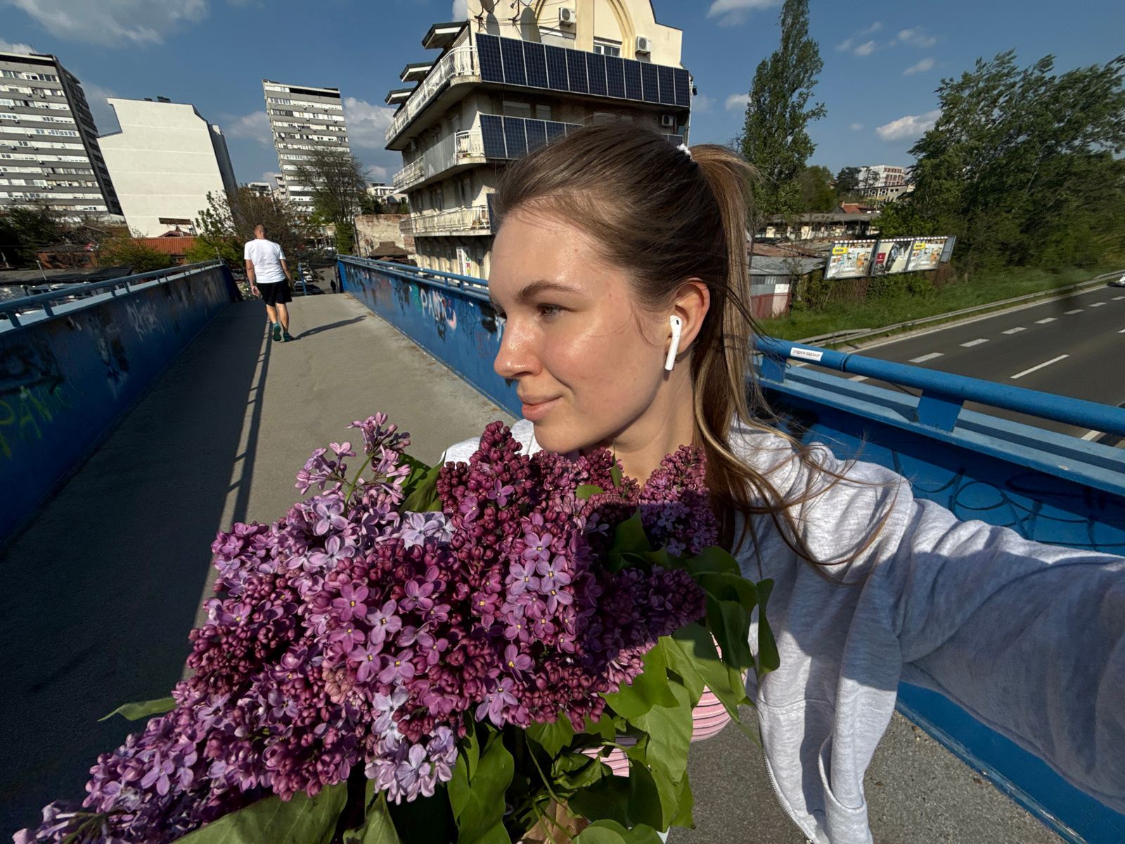 A young woman is captured in a selfie on an elevated pedestrian bridge in Vozdovac Urban Municipality, Serbia, holding a substantial bouquet of purple lilacs. She is seen in profile, looking slightly…read more