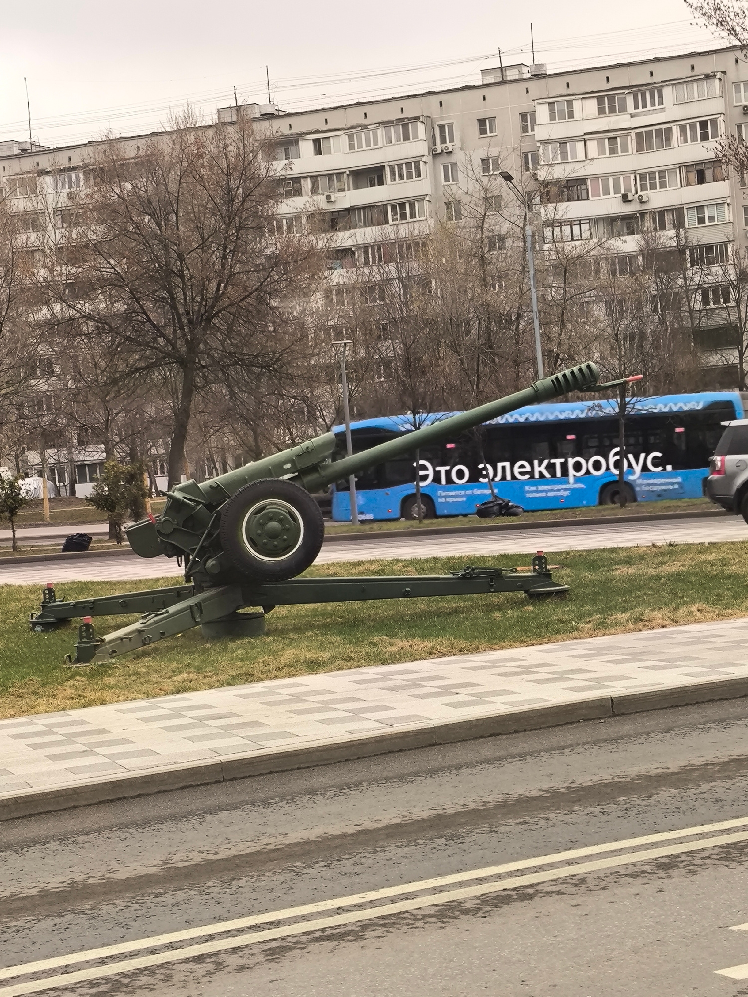 The image shows a cannon on a grassy area adjacent to a street in Moscow, Russia. A blue bus with the inscription "Это электробус." (This is an electric bus) is driving on the street behind the cannon…read more