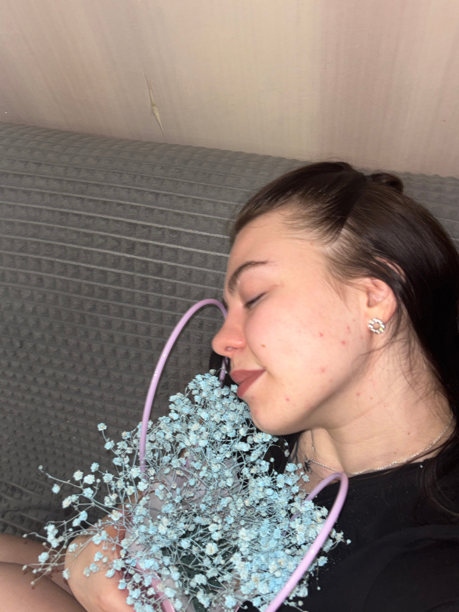 A young woman lies on a gray, horizontally-striped surface, possibly a bed or couch, while holding a bouquet of small, light blue flowers. Her face is visible, showing closed eyes, a silver stud earri…read more