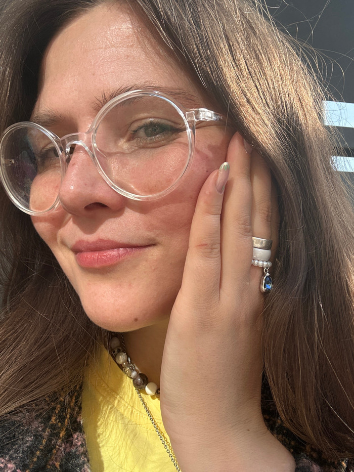 The image displays a close-up portrait of an adult female. She has long, straight brown hair, parted on her left side, framing her face. She wears clear, round-framed eyeglasses through which her gree…read more