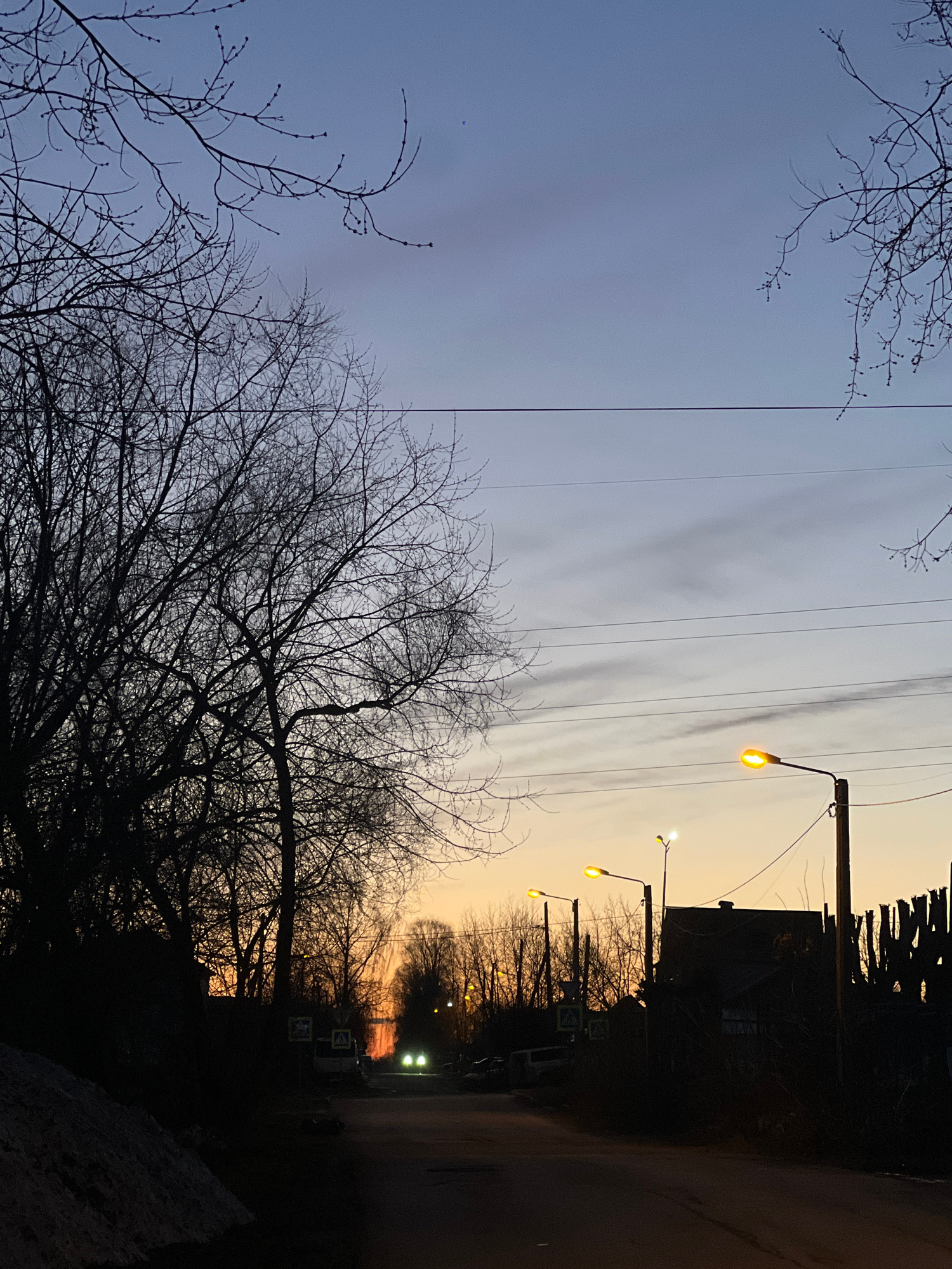 The image captures a twilight scene in Berezniki, Russia. The sky transitions from a muted blue to orange near the horizon. Electrical wires stretch across the sky. Bare trees, silhouetted against the…read more