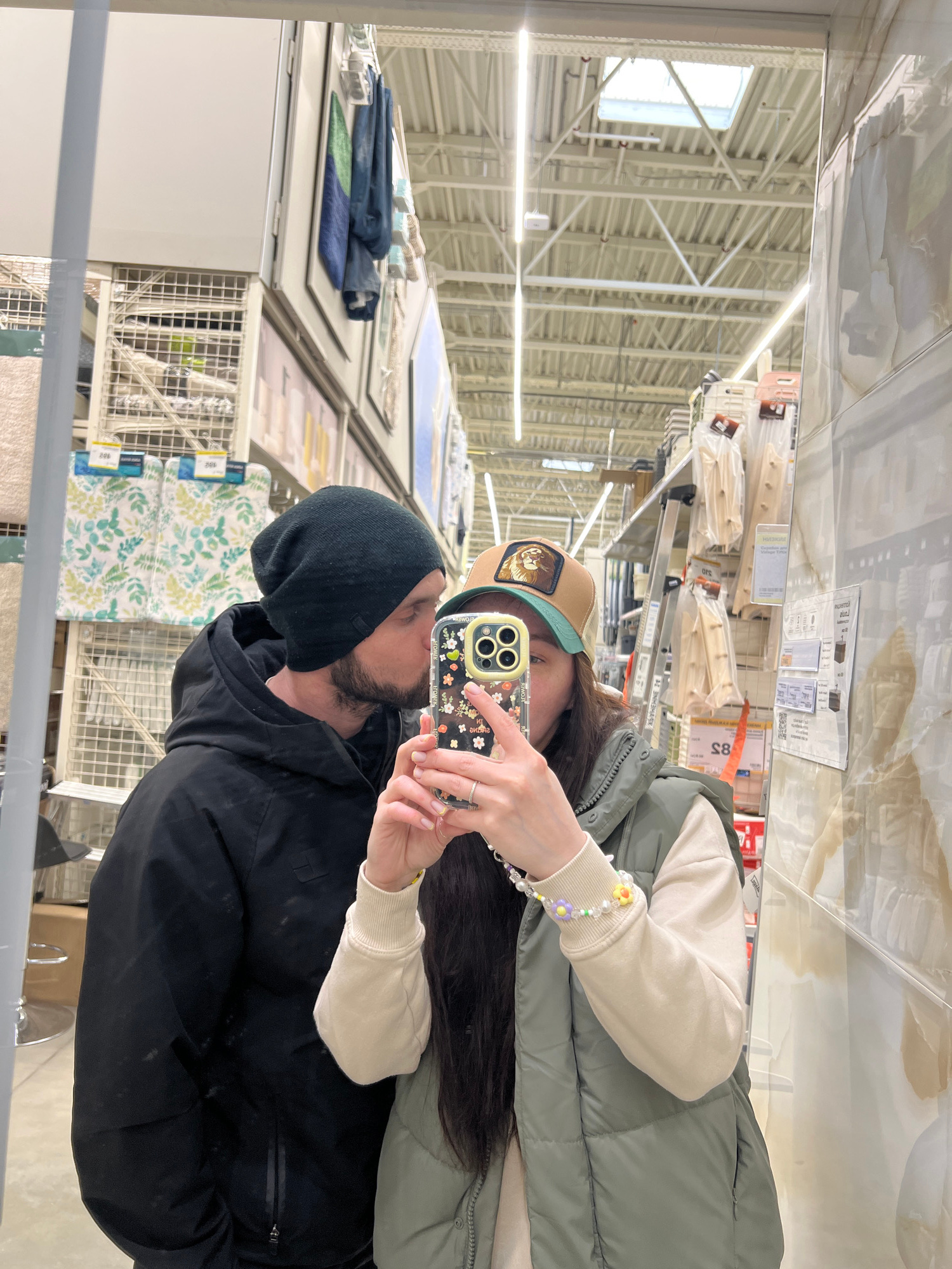 A couple is taking a selfie in a mirror, likely inside a retail store. The female is wearing a tan cap with a lion patch, a green vest, and a beaded bracelet. The male is wearing a black beanie and a…read more