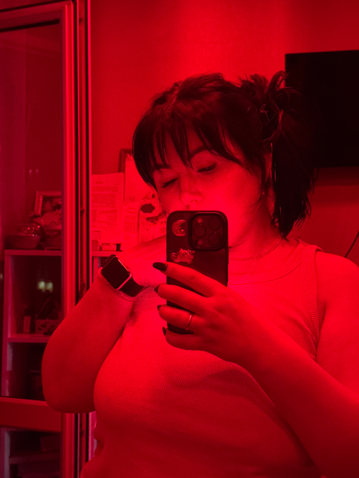 A person with dark hair pulled back and bangs is holding a phone to take a selfie in a mirror. The phone case is dark colored with embellishments on it. The person is wearing a light-colored top and a…read more