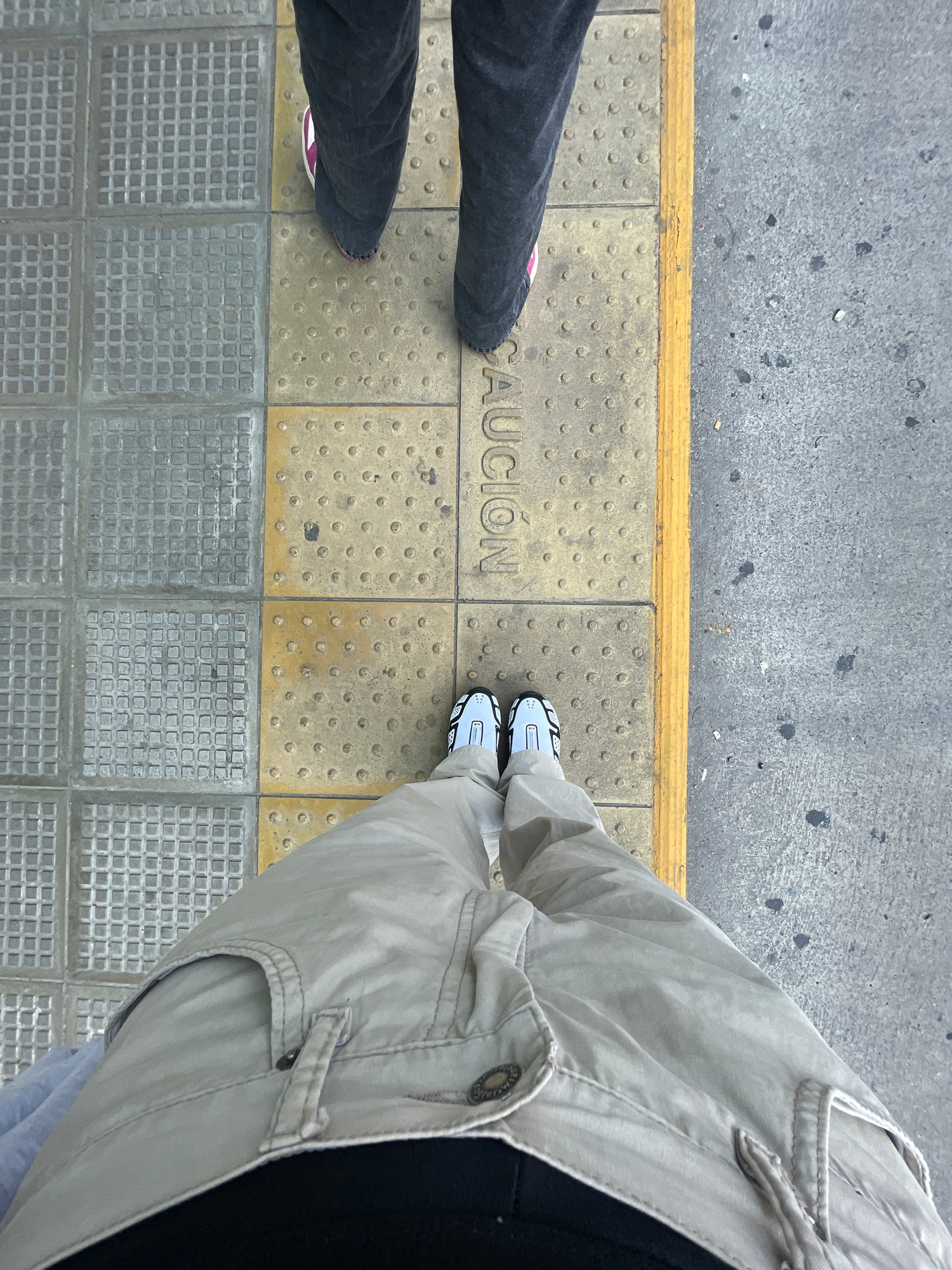 Two people stand on a tactile paving surface marked with "CAUCION" (Spanish for "CAUTION"), bordered by a yellow safety line and adjacent to standard pavement. One individual wears black jeans and sne…read more