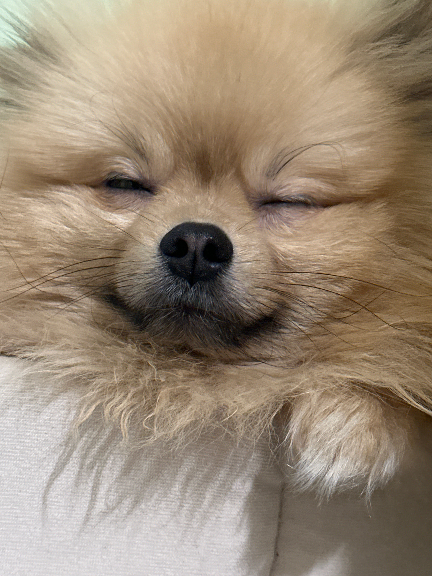 A close-up photograph shows a fluffy, light brown Pomeranian dog sleeping. The dog's eyes are closed, and its black nose is centered in the frame. The dog is lying on a light-colored, textured surface…read more