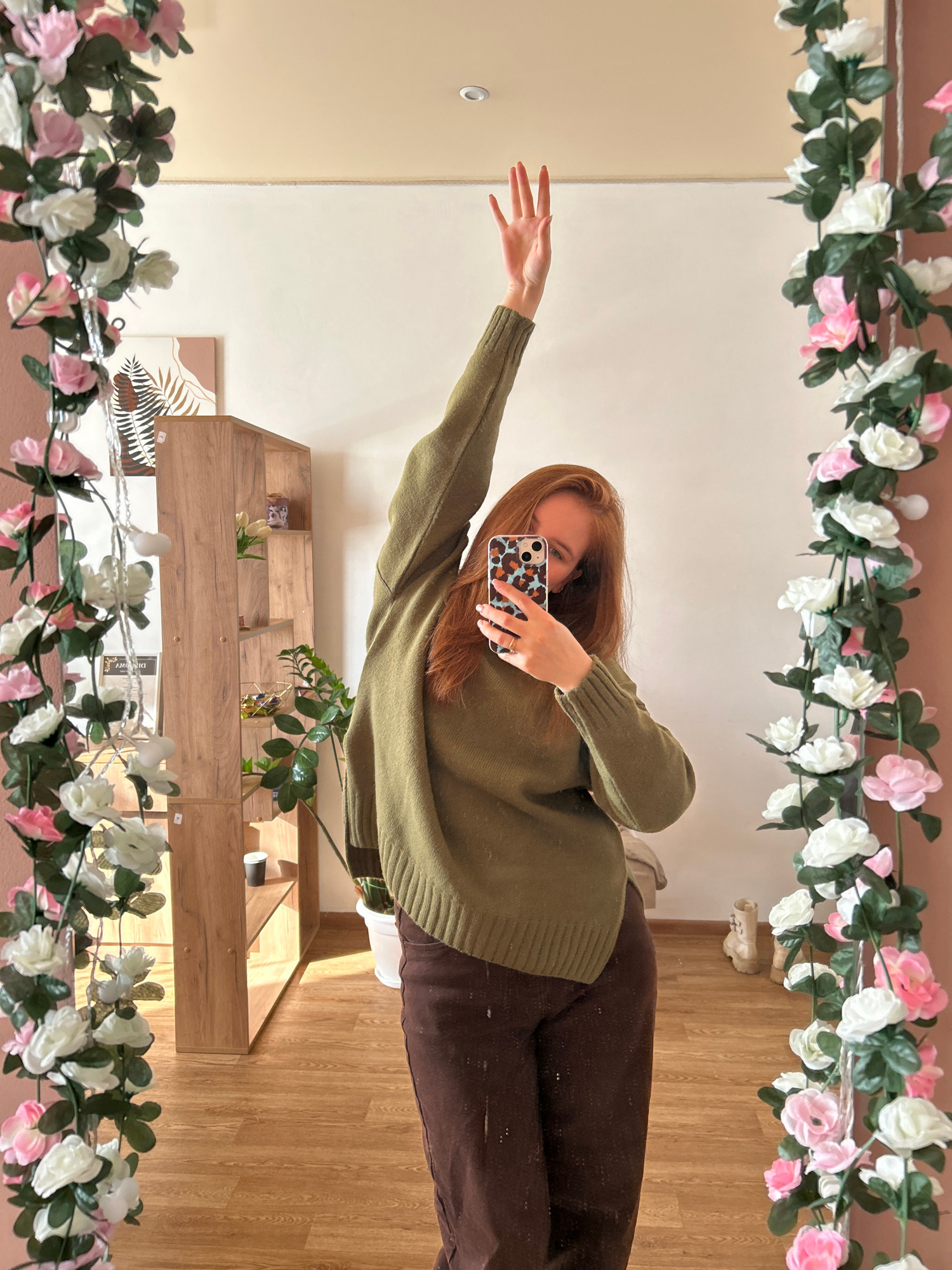 A young woman takes a selfie in front of a mirror decorated with artificial flowers. She wears an olive-green sweater and brown pants. Her right arm is raised. The background includes a shelf with dec…read more