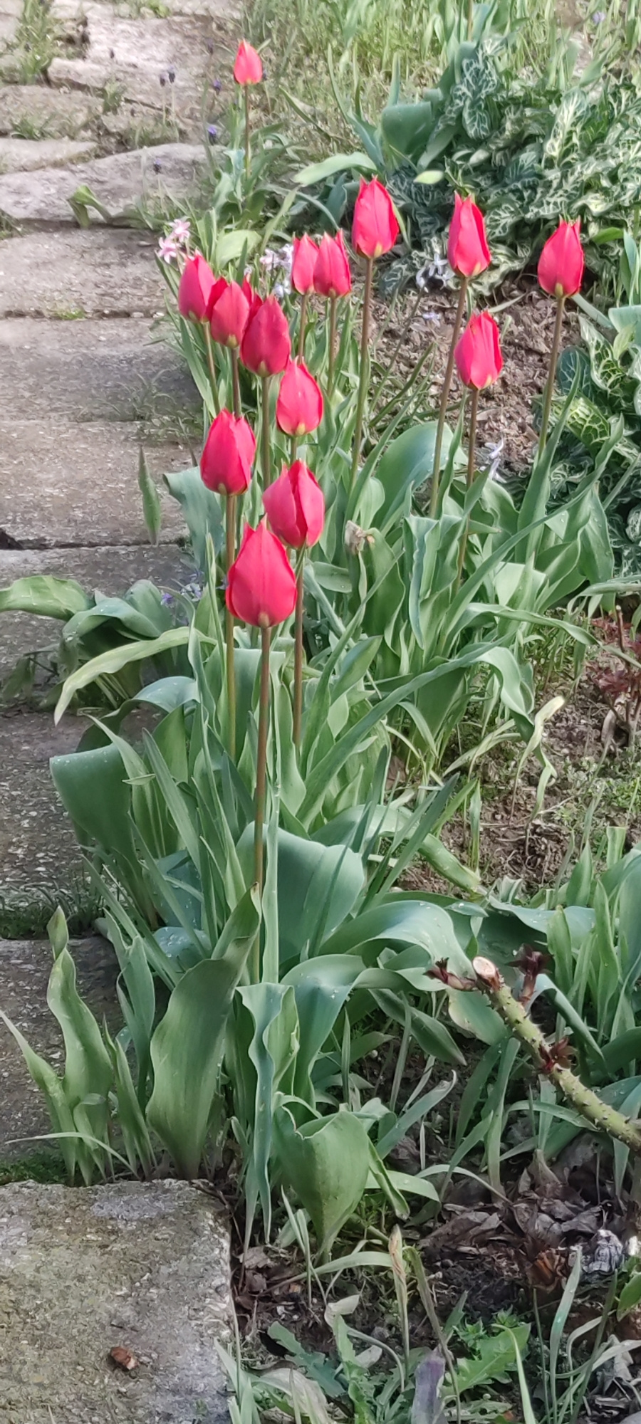 The image shows a cluster of red tulips in a garden setting. The tulips are in various stages of bloom, with some buds still closed and others fully open. The leaves of the tulips are a vibrant green.…read more