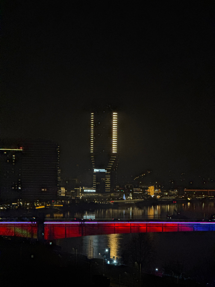 A night view depicts a city skyline, showcasing illuminated buildings reflected in water. A bridge spans the scene, marked by vibrant red and blue lights. Prominent structures, including the "BW" and…read more