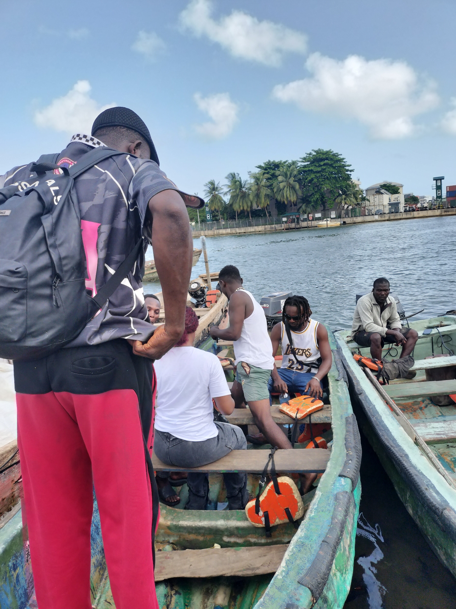 A group of six men is gathered in and around two small, open wooden motorboats on a calm waterway, likely a river or canal, under a bright blue sky with scattered white clouds. The scene suggests prep…read more