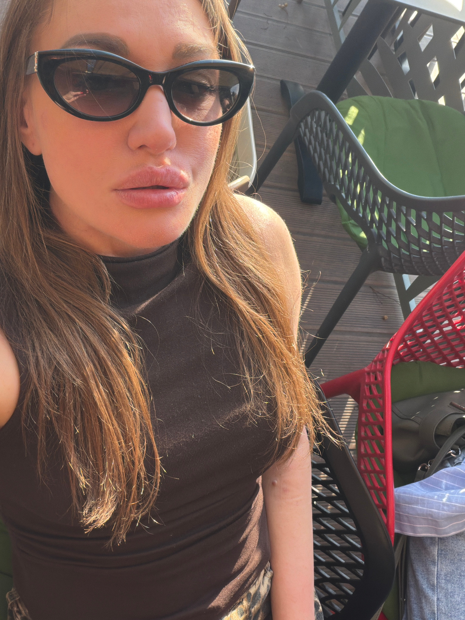 The image shows a woman with long brown hair, wearing sunglasses and a brown top. She is sitting outside on a wooden deck, likely at a cafe or restaurant, as indicated by the presence of multiple chai…read more