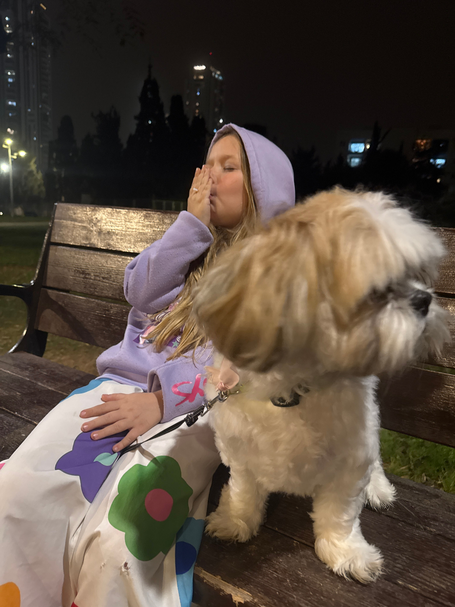 A young girl with long blonde hair and a purple hooded sweatshirt sits on a wooden bench outdoors, next to a fluffy white and brown dog. The girl is making a kissing gesture with her hand towards the…read more