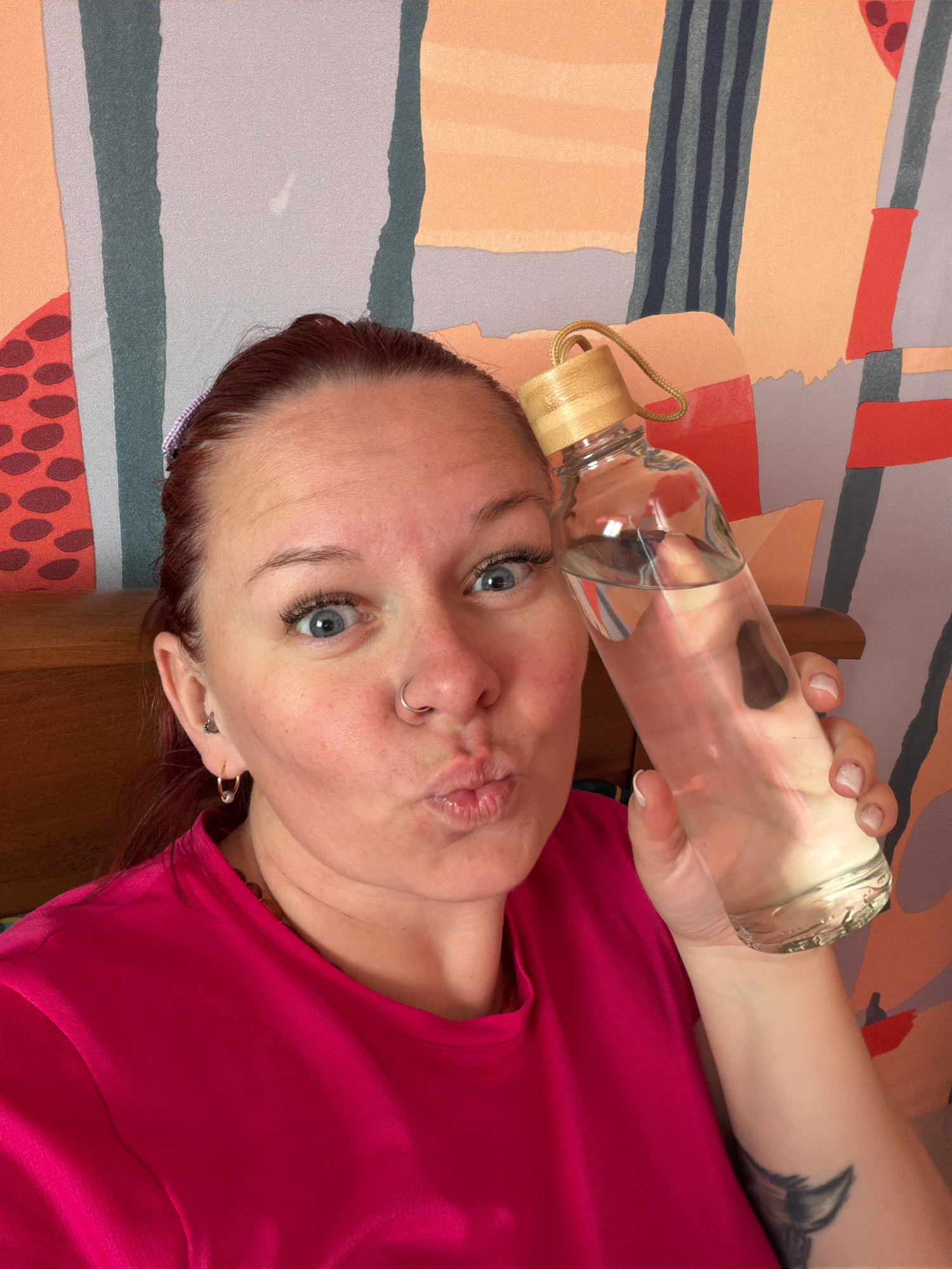 The image is a selfie of a fair-skinned woman with blue eyes and reddish-brown hair. She is wearing a pink shirt and has multiple piercings in her left ear and a nose ring. She is holding a clear glasβ¦read more
