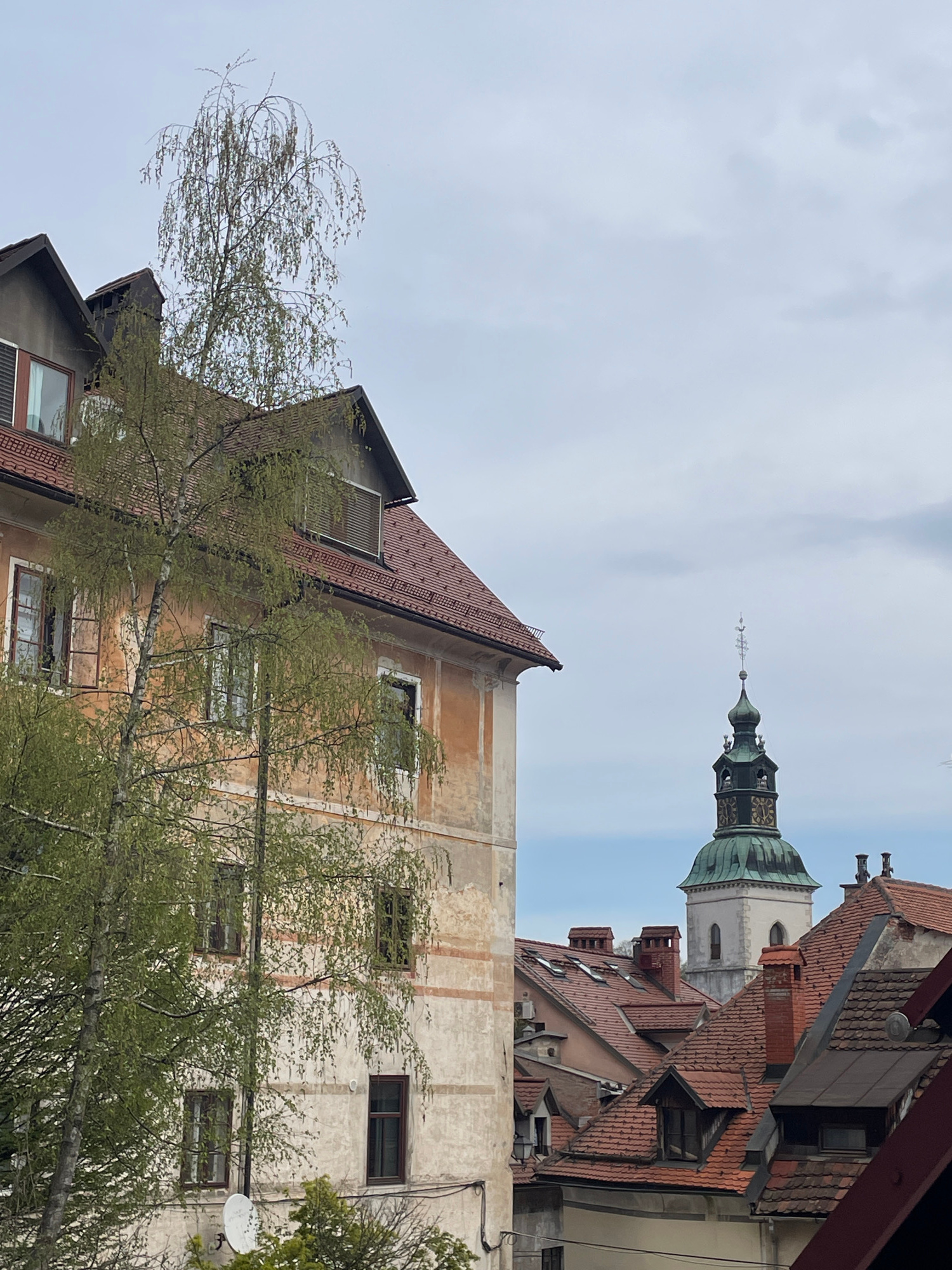 The image shows a view of buildings and a church tower in Skofja Loka, Slovenia. The focus is on an old building with a red tile roof and a worn, yellowish-white facade. A tree with sparse green leave…read more