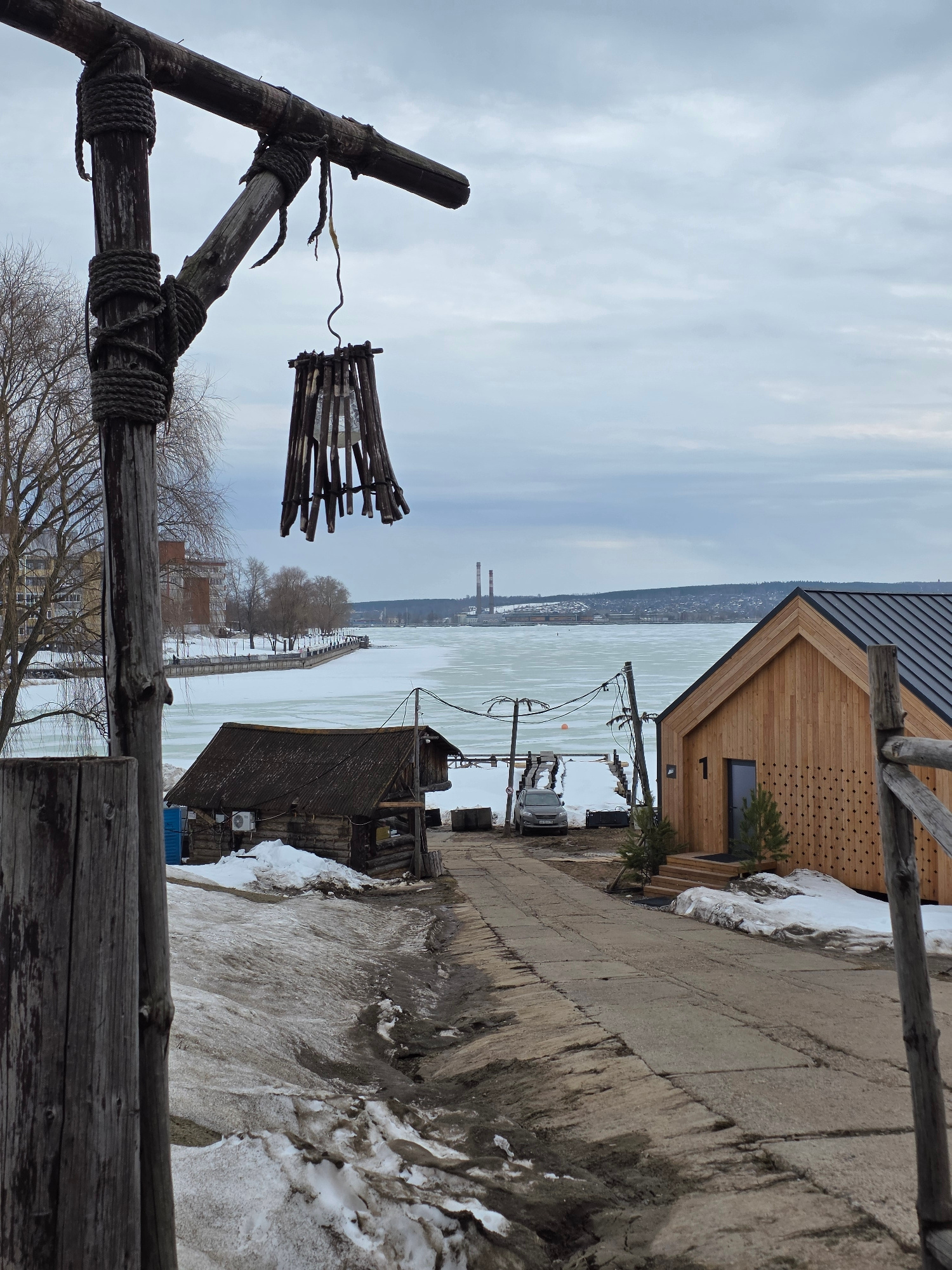 The image depicts a waterfront scene in Votkinsk, Russia, likely in winter. A partially frozen body of water stretches across the middle ground, with industrial smokestacks visible on the opposite sho…read more