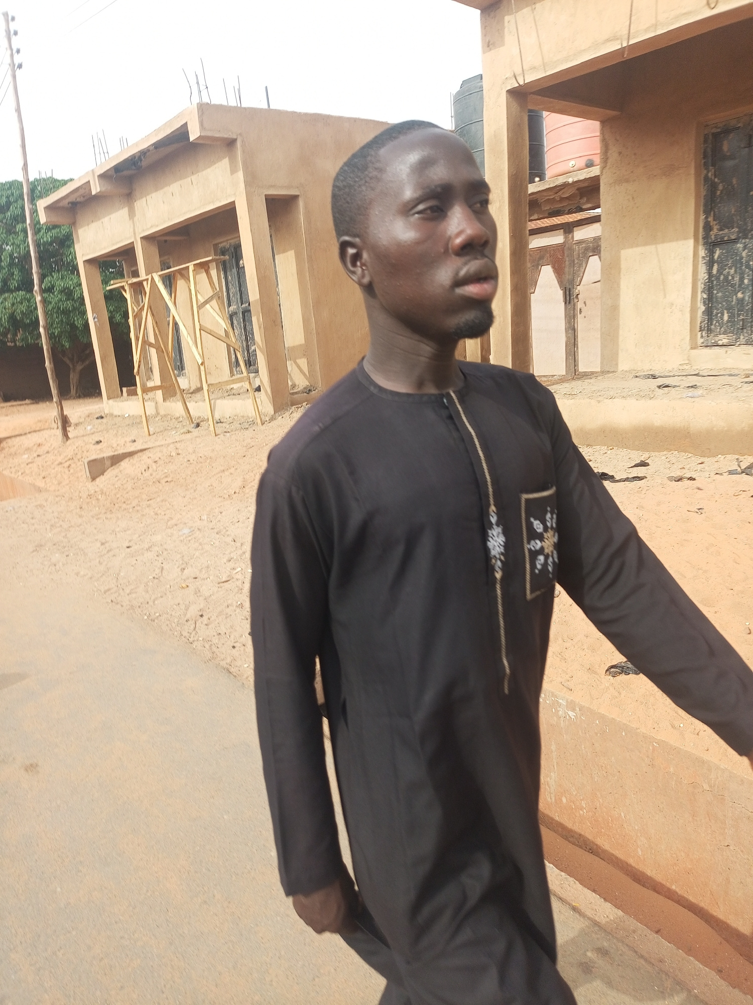 A man is standing on a paved surface near what appears to be a residential area in Gombe, Nigeria. He is wearing a long-sleeved, dark-colored garment with decorative detailing on the chest. Behind him…read more