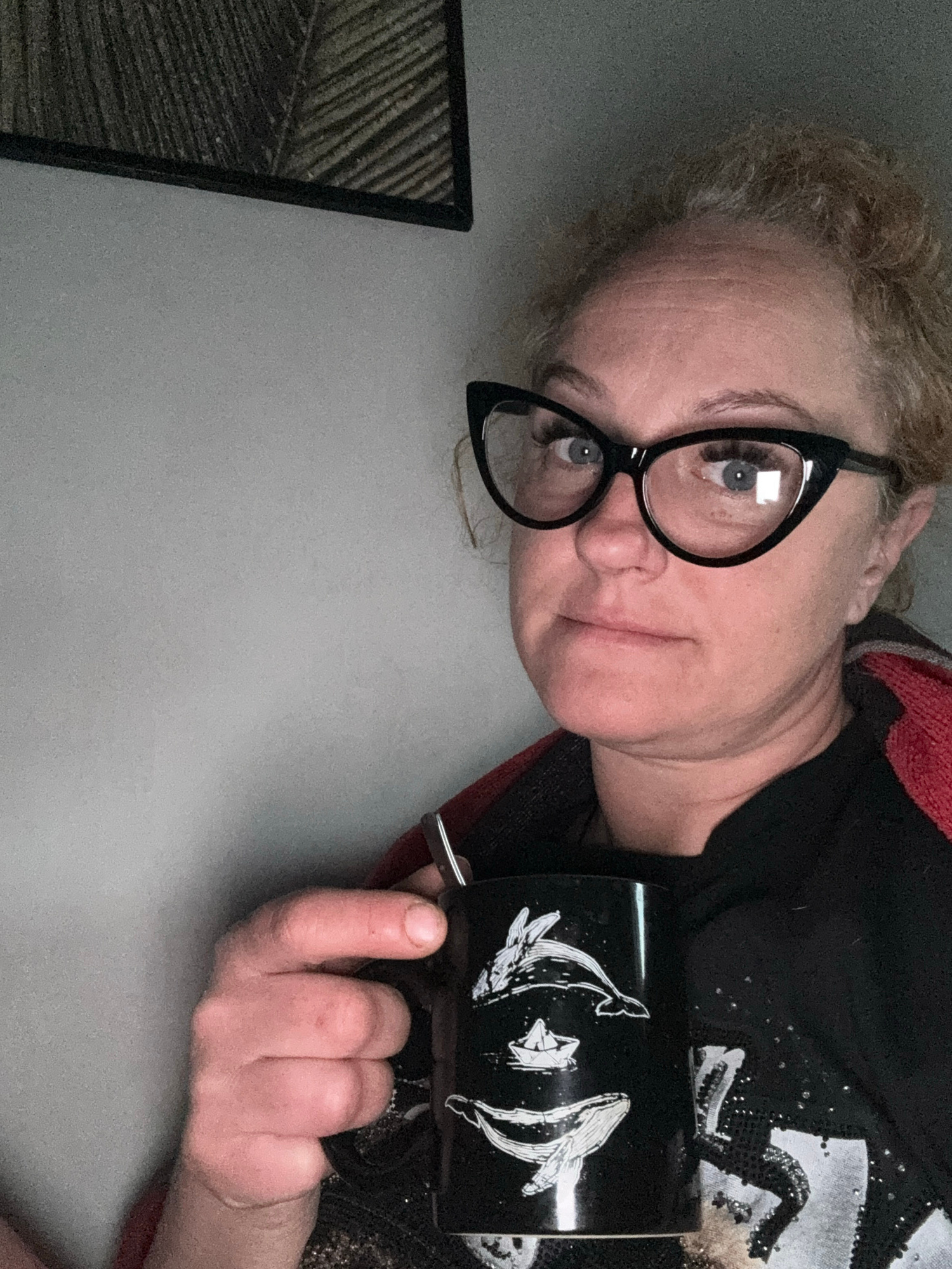 A selfie-style, low-angle shot features a woman with fair skin and blonde hair wearing black-rimmed glasses. She holds a black mug with a white design featuring two whales and a paper boat, her right…read more