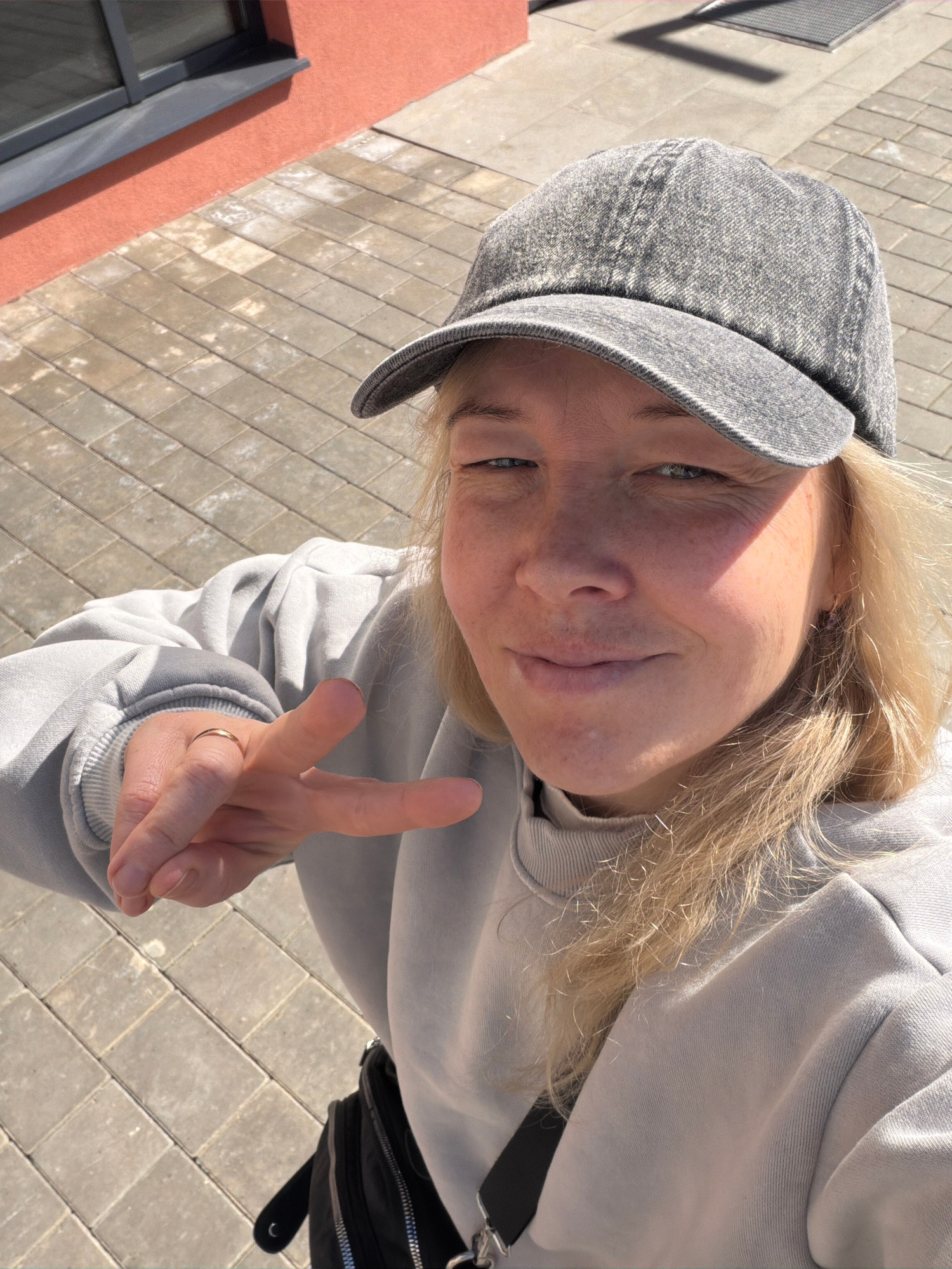 A blonde-haired woman wearing a gray cap and a gray hoodie is seen making a peace sign with her right hand. The woman is also wearing a gold ring. The background includes a brick-paved area and a buil…read more