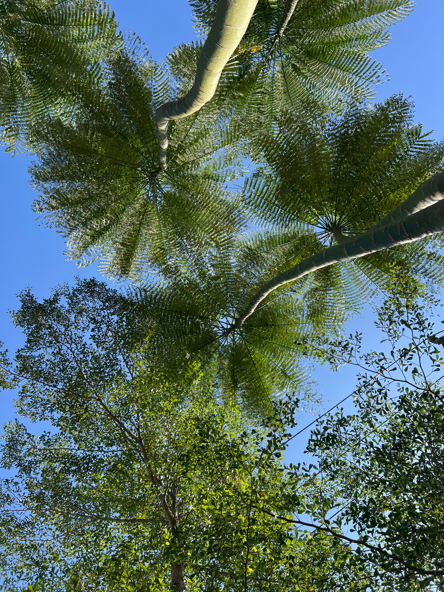 The image, taken in the Ubud District of Indonesia, presents an upward view into the canopies of trees against a clear blue sky. Three palm trees with fern-like fronds dominate the left and center porβ¦read more