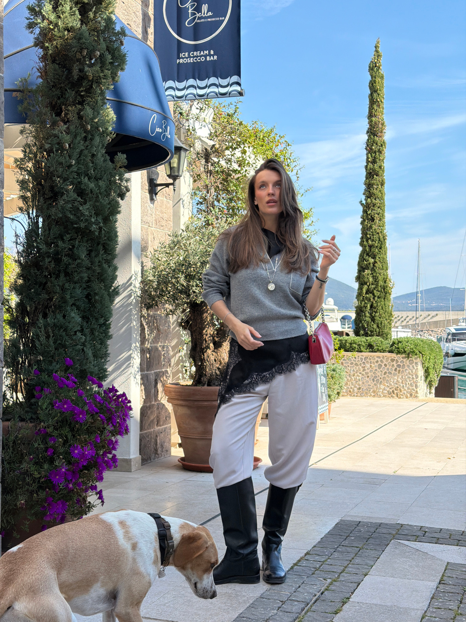A young adult woman stands in Radovići, Montenegro, posing for a photo in front of the "Bella" gelato and prosecco bar. She wears a gray sweater, light-colored pants with lace trim, and black boots, c…read more