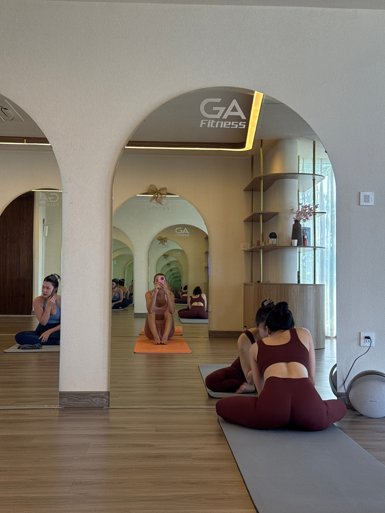 Here is a description of the image: The image shows the interior of a yoga studio, likely in Unknown, Unknown, as indicated by the "GA Fitness" logo visible on a mirror. A woman is kneeling on a gray…read more