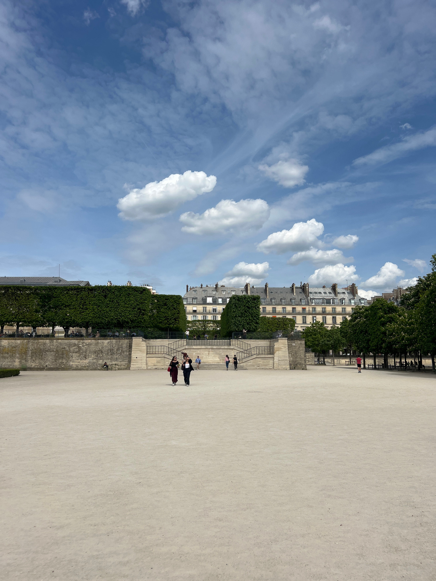 This daytime photograph captures a wide outdoor scene in a Parisian park or garden. The foreground and much of the middle ground are dominated by a vast, open expanse covered in light-colored sand or…read more