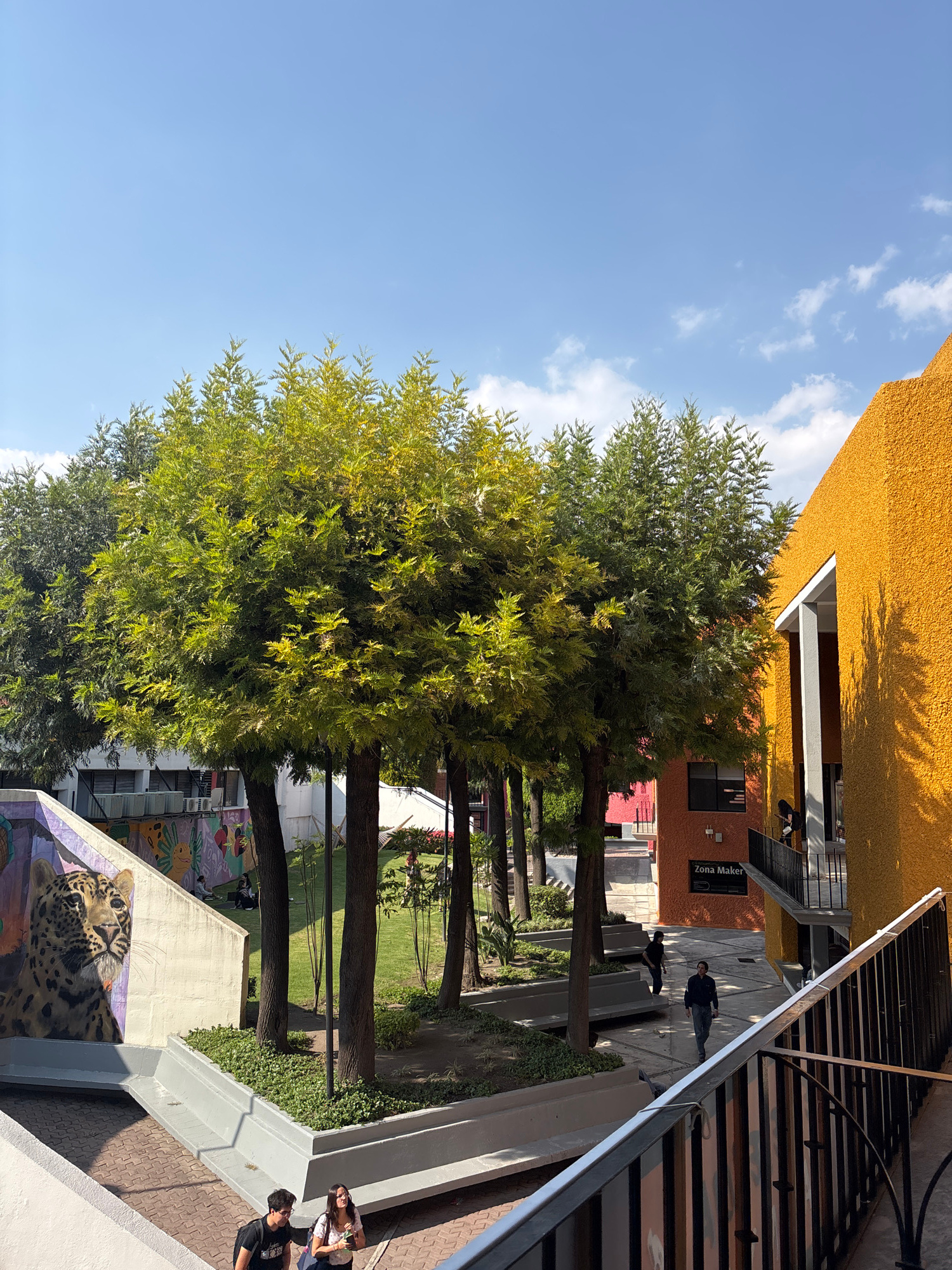 This image shows a street scene in San Andrés Cholula, Mexico. In the foreground, a line of trees stretches down the street, flanked by low walls. One wall features a mural of a jaguar's face. Behind…read more