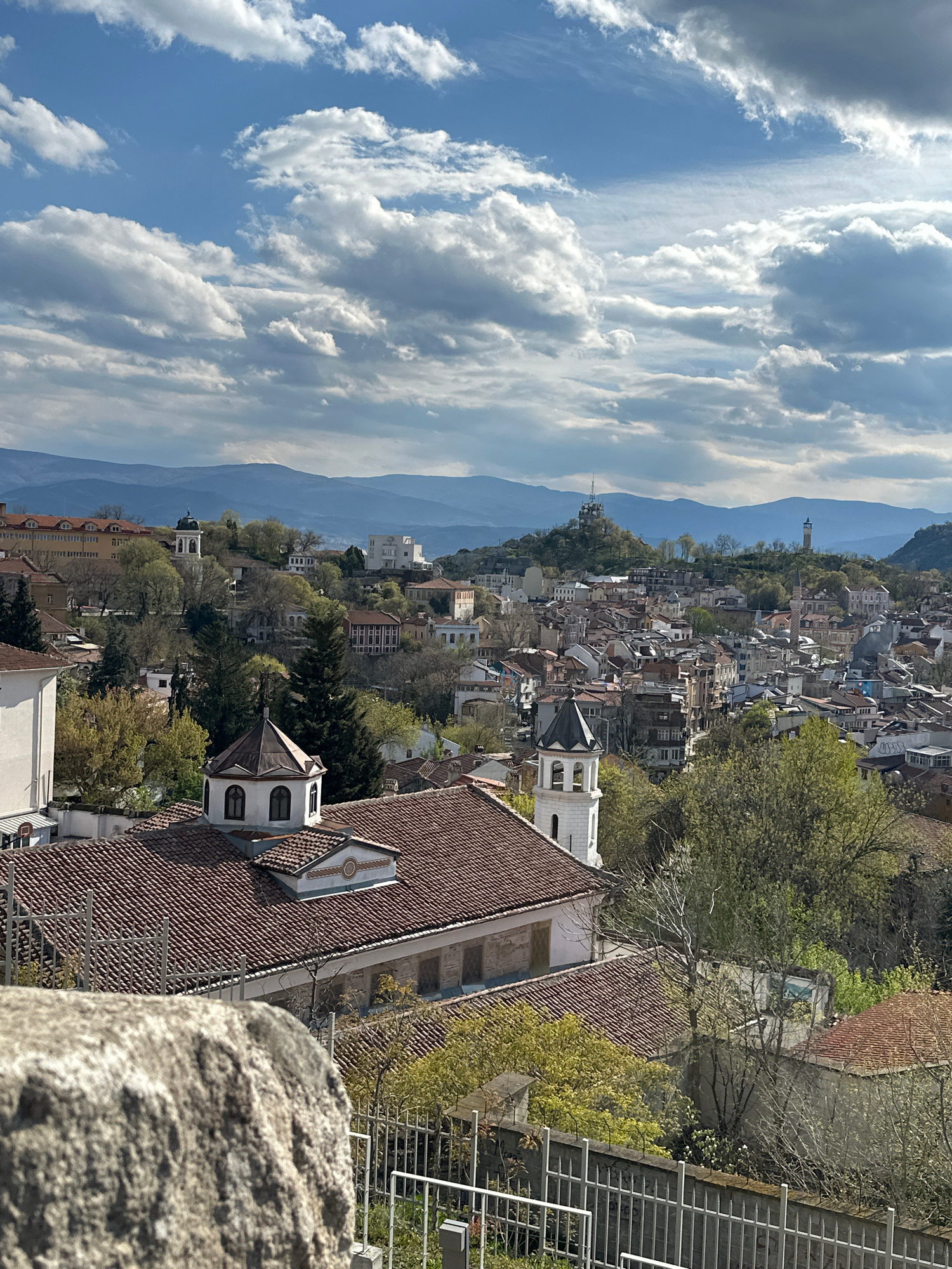 The image shows a cityscape view in Plovdiv, Bulgaria, taken from an elevated position. A blue sky with scattered white clouds occupies the left side of the frame. Mountains are visible in the backgroβ¦read more