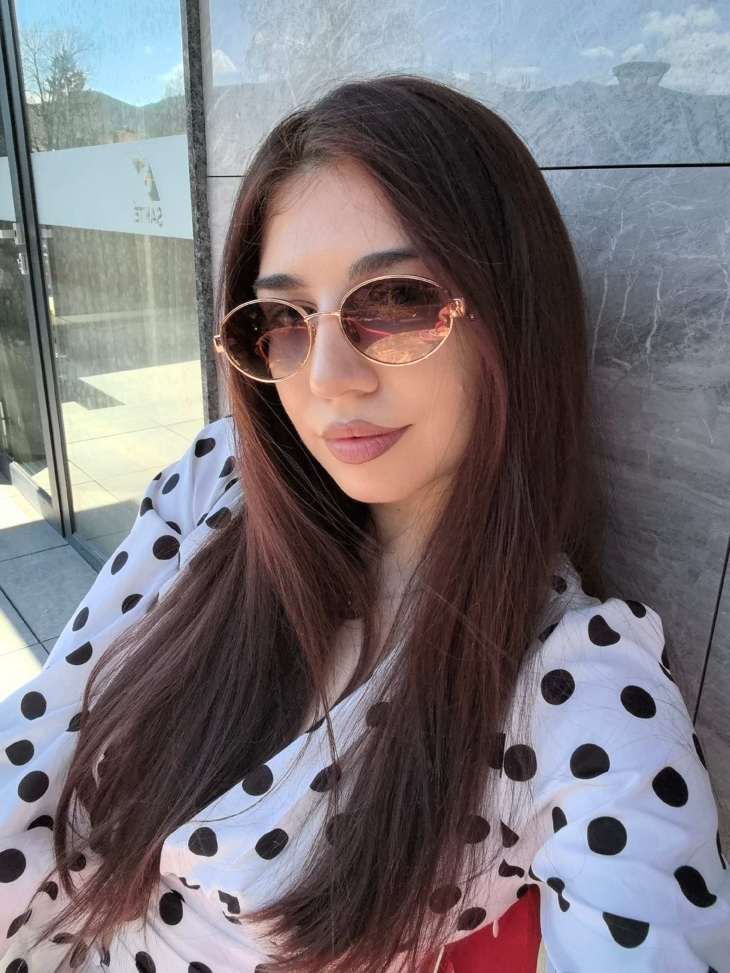 A woman with long brown hair, wearing rose-tinted sunglasses and a white blouse with black polka dots, is leaning against a grey marble wall. The setting appears to be outdoors in Velingrad, Bulgaria.…read more