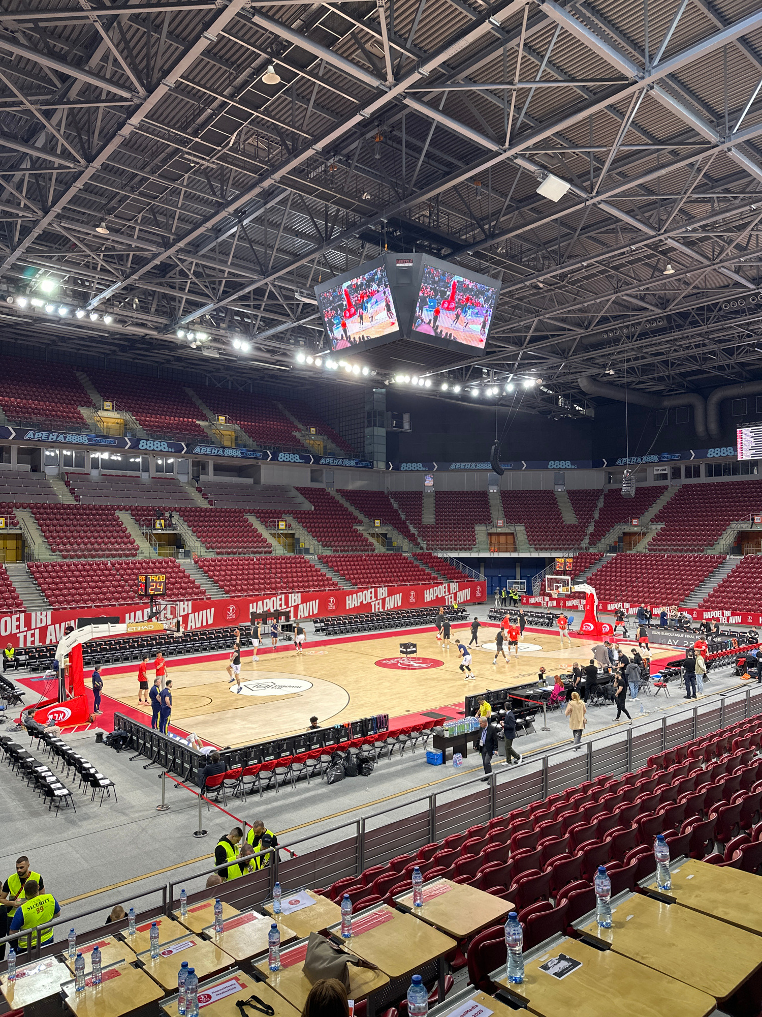 The image shows the interior of Arena Sofia in Sofia, Bulgaria, during a basketball game. The arena has a high, complex metal roof structure and large video screens hanging from the ceiling. Rows of r…read more