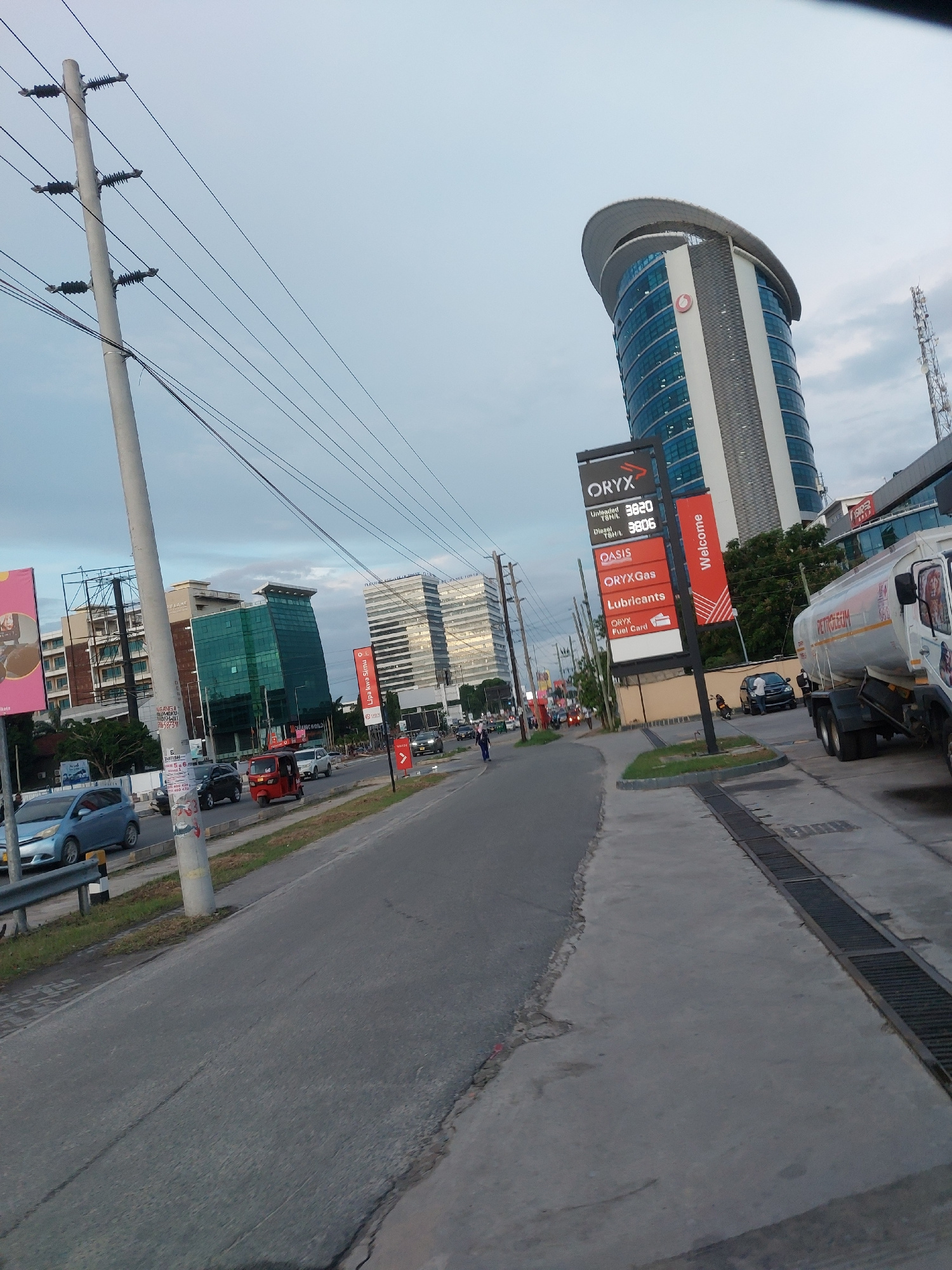 The image depicts a street scene in Dar es-Salaam, Tanzania. In the foreground, there's a view of an Oryx petrol station with a sign displaying fuel prices and advertisements for lubricants. Above the…read more