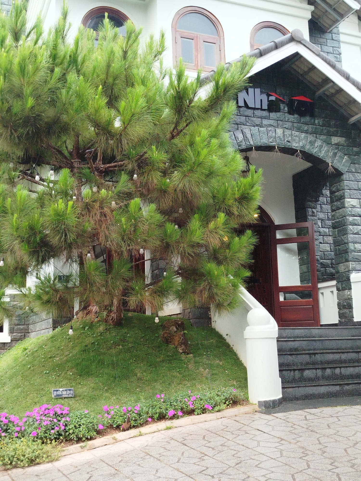 The image shows a building with a stone facade and a sign reading "Nha" above the entrance. A large pine tree, adorned with strings of lights, partially obscures the building. The tree is planted on a…read more