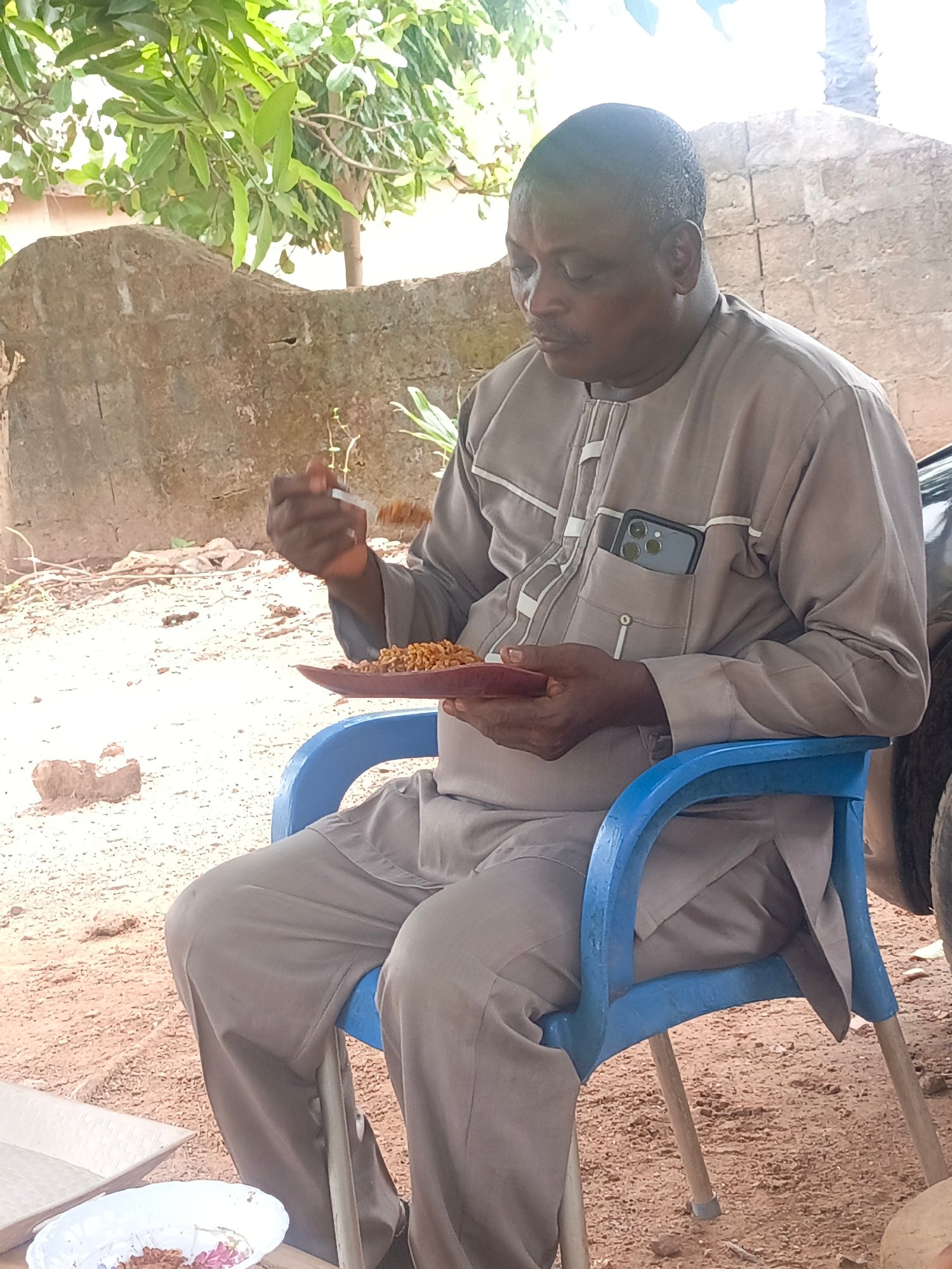 A man is seated outdoors in Akwanga, Nigeria, eating food from a brown plate with a fork. He is sitting in a blue plastic chair. The man is wearing a grey outfit with white trim and has a phone in his…read more