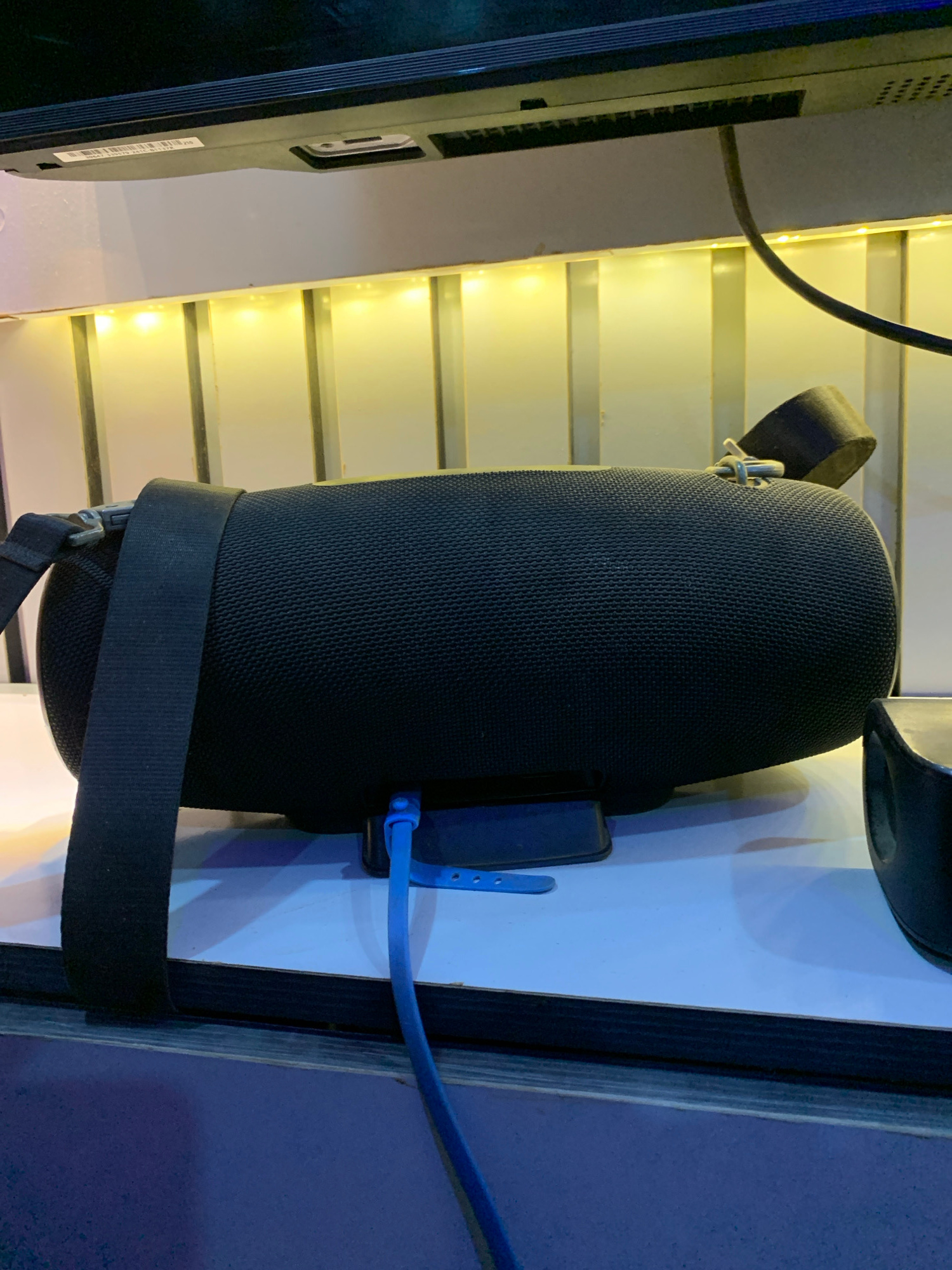 A black backpack with straps is mounted on a light grey panel. A blue cable is routed through a loop on the backpack. A black cable runs along a light grey and yellow-lit lattice panel. A black electr…read more