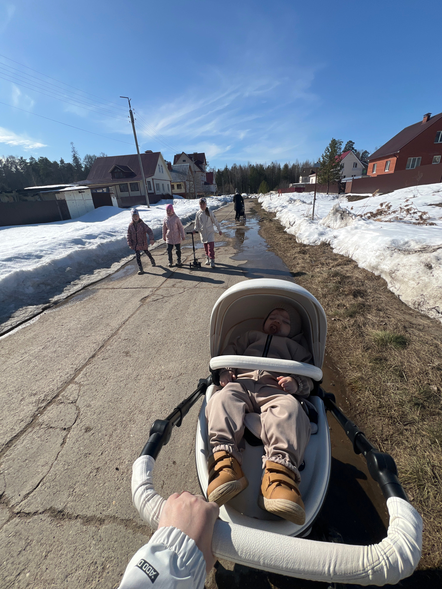 The image depicts a first-person view of an outdoor scene on a sunny day in Noviy, Russia, characterized by melting snow. In the immediate foreground, a person's hands, clad in a light-colored jacket…read more
