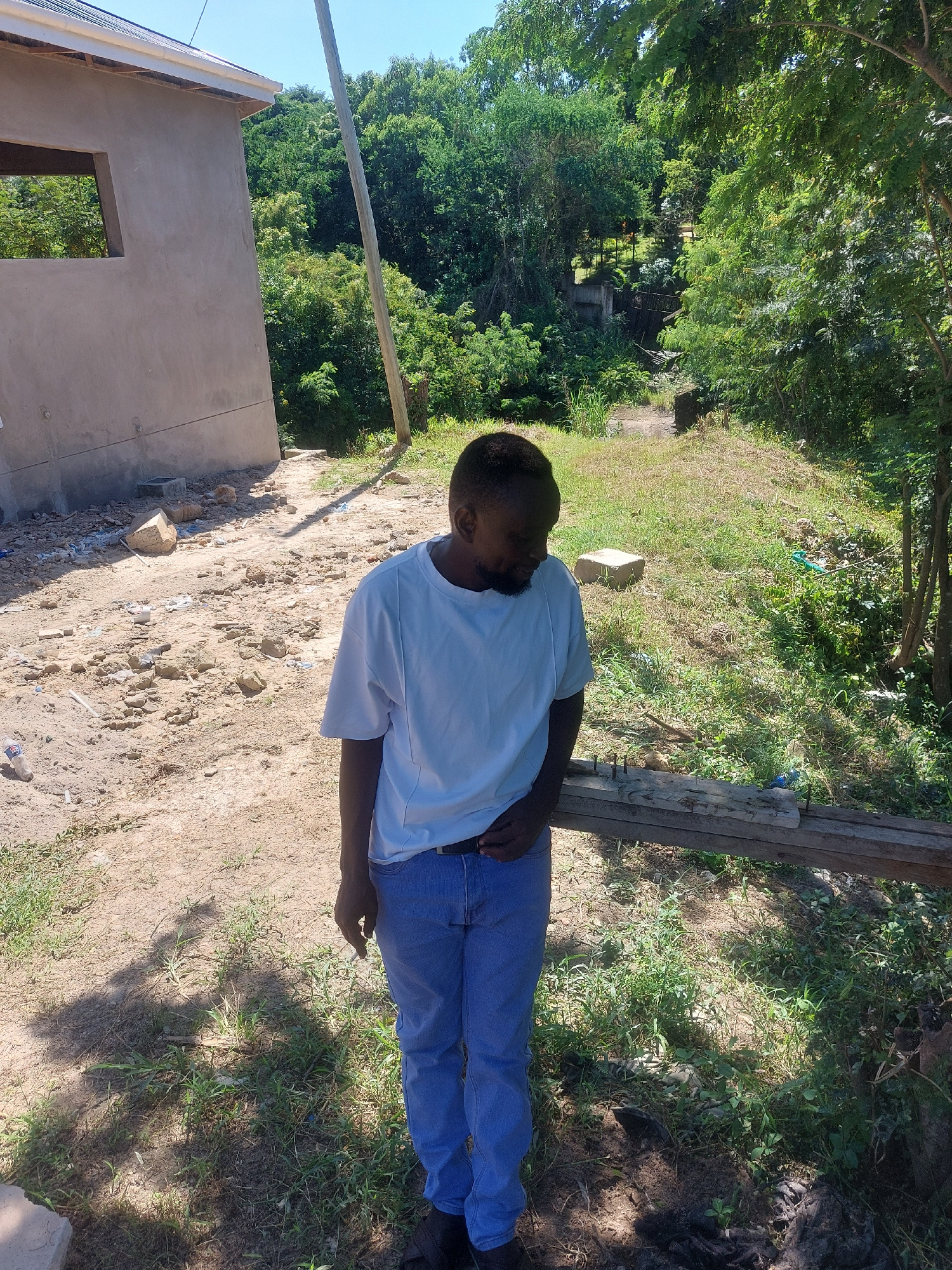 The image shows a man in Dar es-Salaam, Tanzania. He is wearing a white t-shirt and blue jeans, standing on a dirt ground. To his left is a partially constructed building with a window opening. The sc…read more