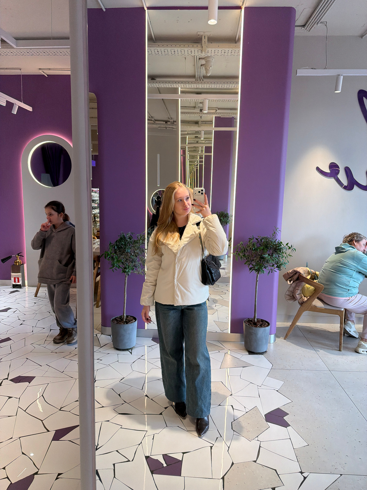 A woman stands in a modern, indoor space. She is fair-skinned with long blonde hair. She wears a white jacket, dark top, blue jeans, and dark shoes. She is holding a cell phone in her left hand, as if…read more