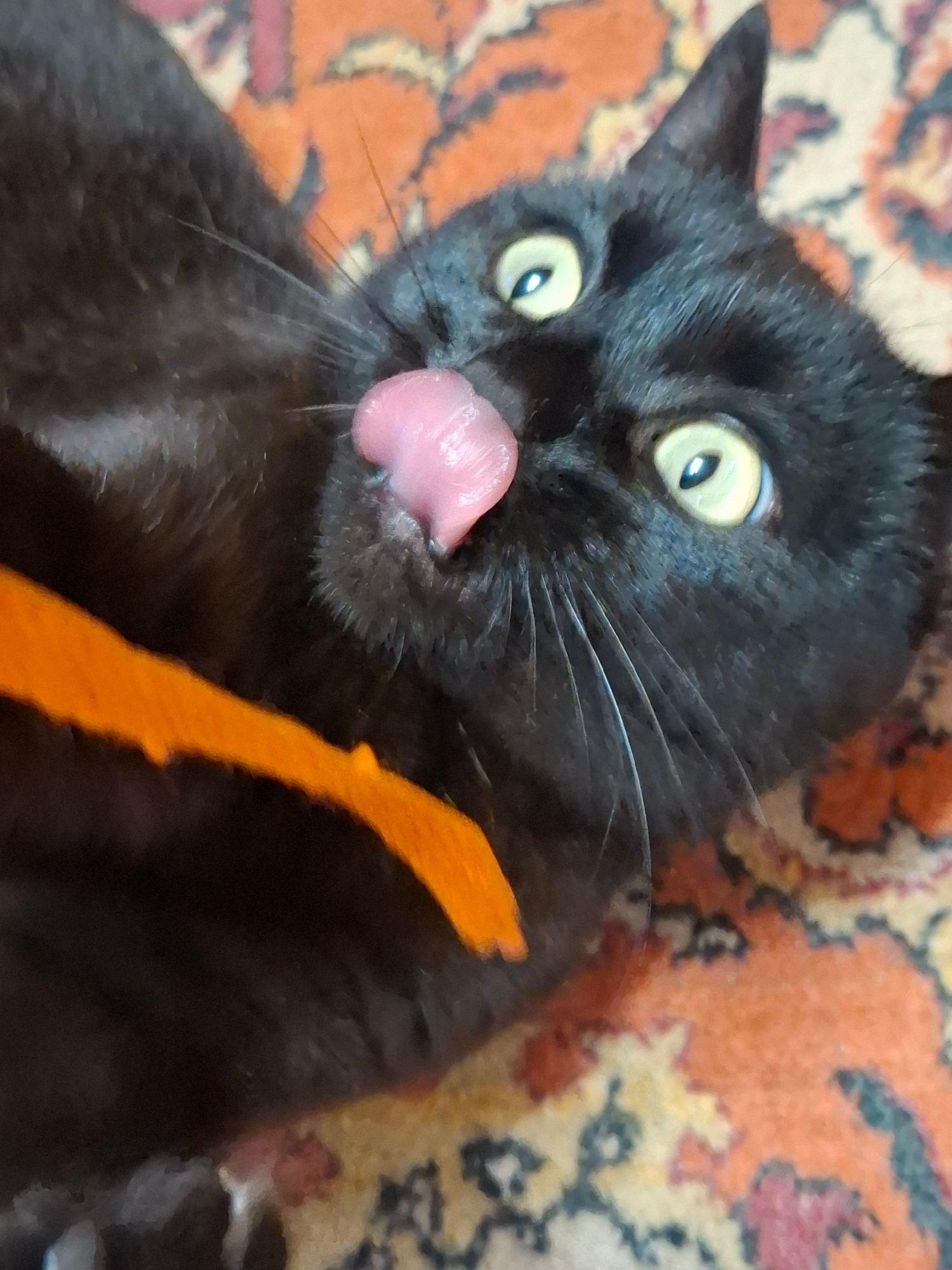 A black cat with yellow eyes is sticking its tongue out. The cat is lying on a patterned rug. An orange object is partially visible in the lower right of the frame. The photo was taken in Khlevnoye, R…read more