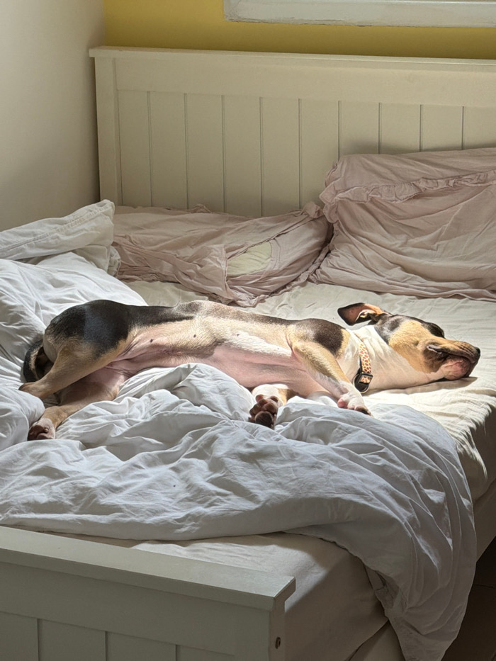 This image depicts an interior bedroom scene, likely within a residence in Tel-Aviv, Israel; the precise address is not identifiable. A medium-sized, short-haired dog, characterized by black, tan, and…read more