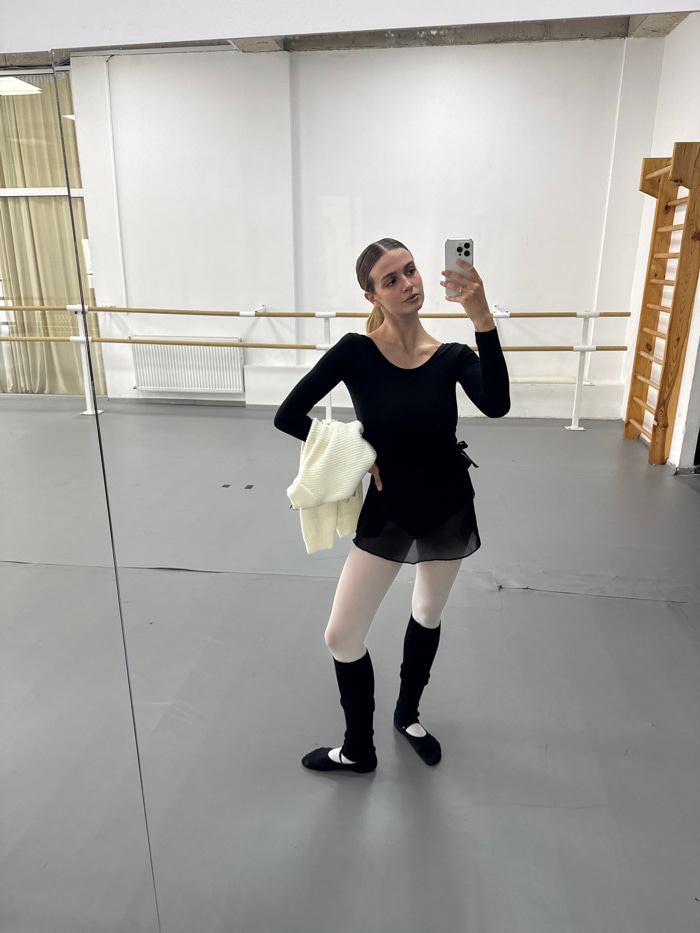 A female subject is captured in a mirror selfie within a dance studio, inferentially located in Tbilisi, Georgia. The subject, an adult female with light brown hair secured in a low style, is dressed…read more