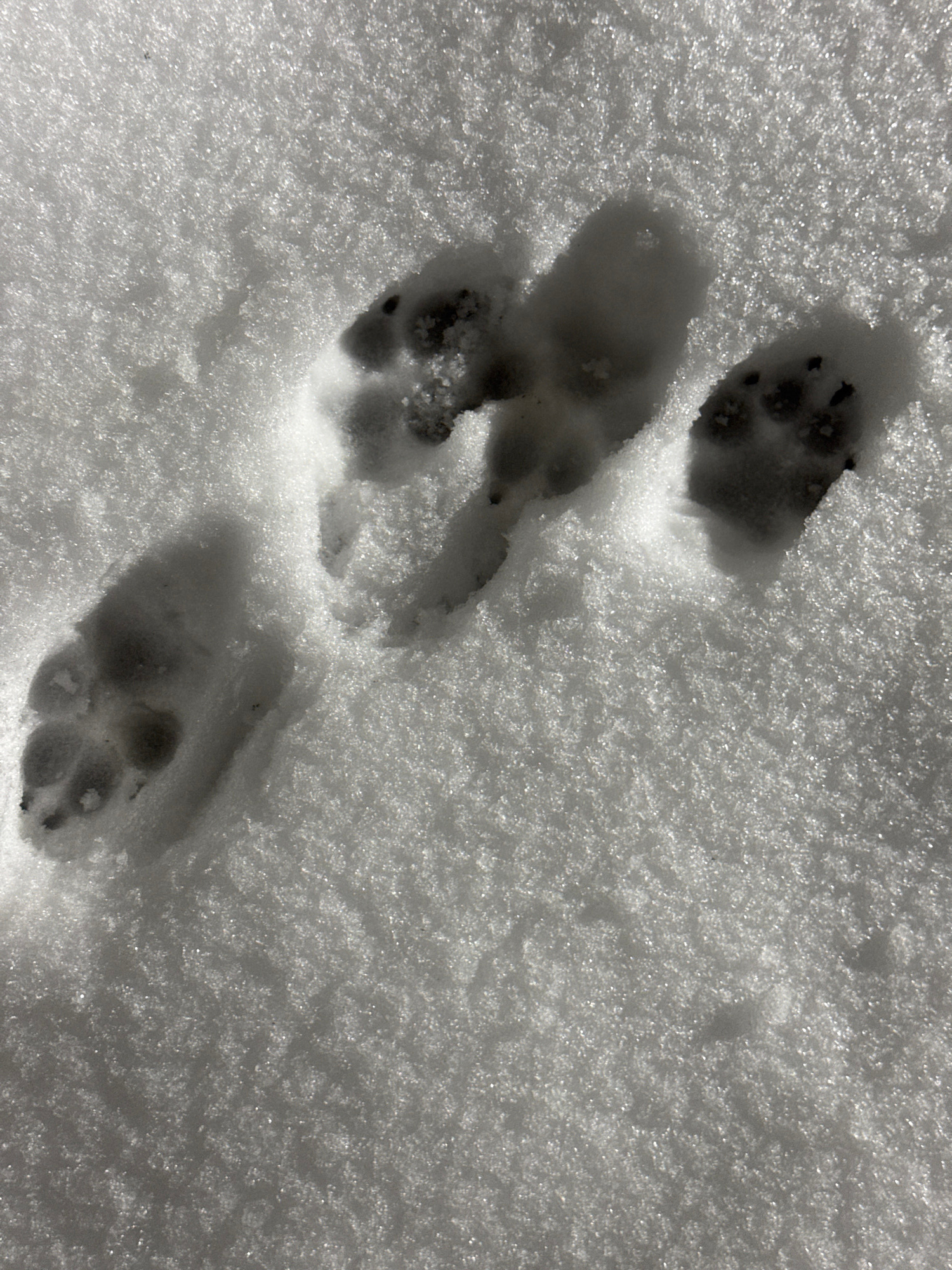 The image shows three paw prints in the snow. The tracks are in a line and show the imprint of a paw with four toe pads and a larger heel pad. The surrounding snow is white and grainy in texture. The…read more