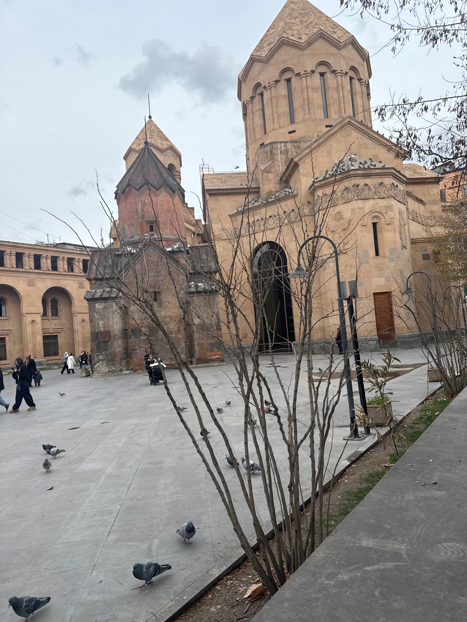 The image captures the Etchmiadzin Cathedral in Yerevan, Armenia, from an elevated perspective, with a slight rotation. The architecture of the cathedral is prominently displayed, featuring its beige…read more